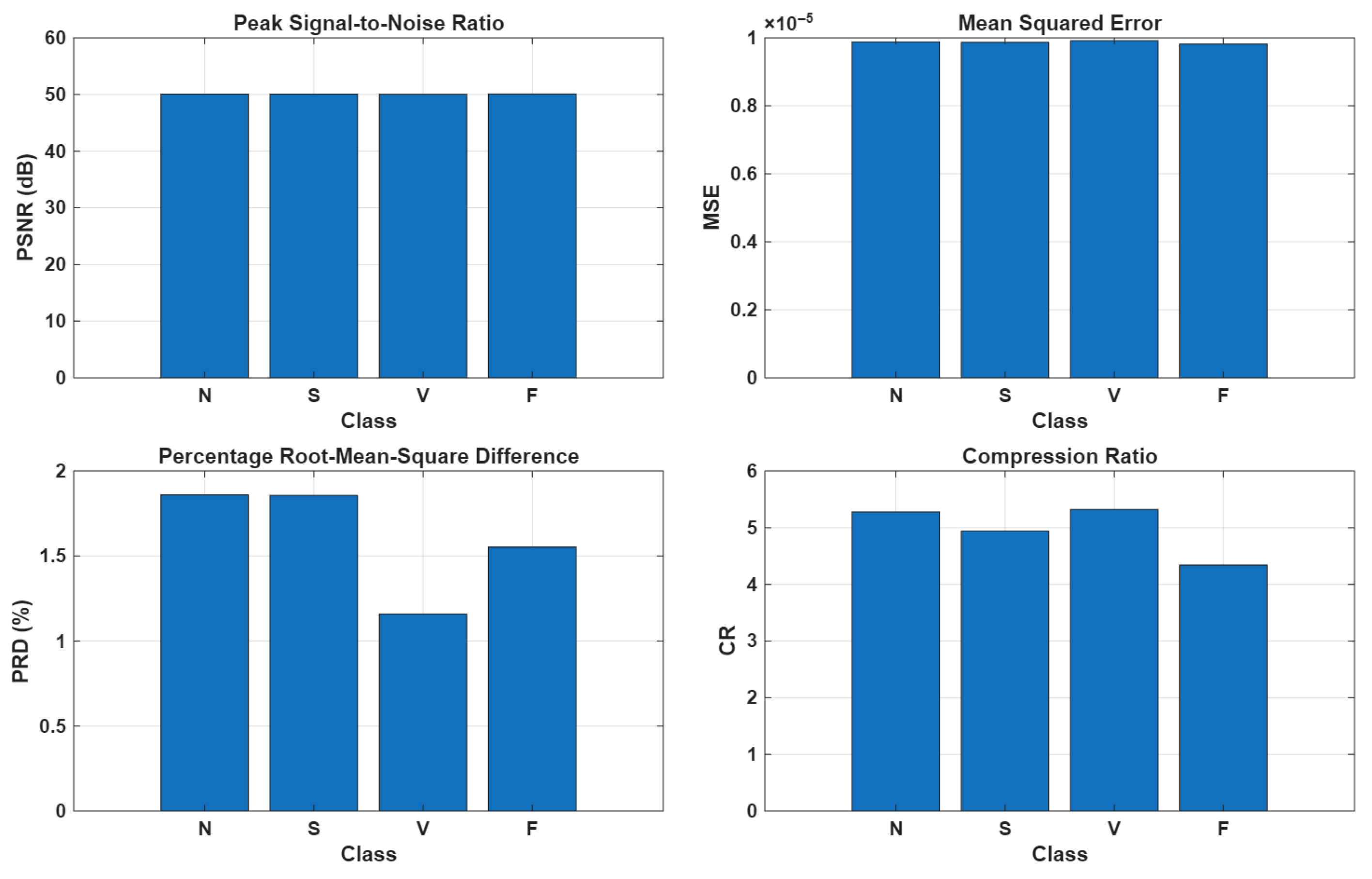 Figure 10, the compression stage applied to real ECG segments demonstrated promising performance, achieving a high PSNR of approximately 50 dB, a low MSE on the order of