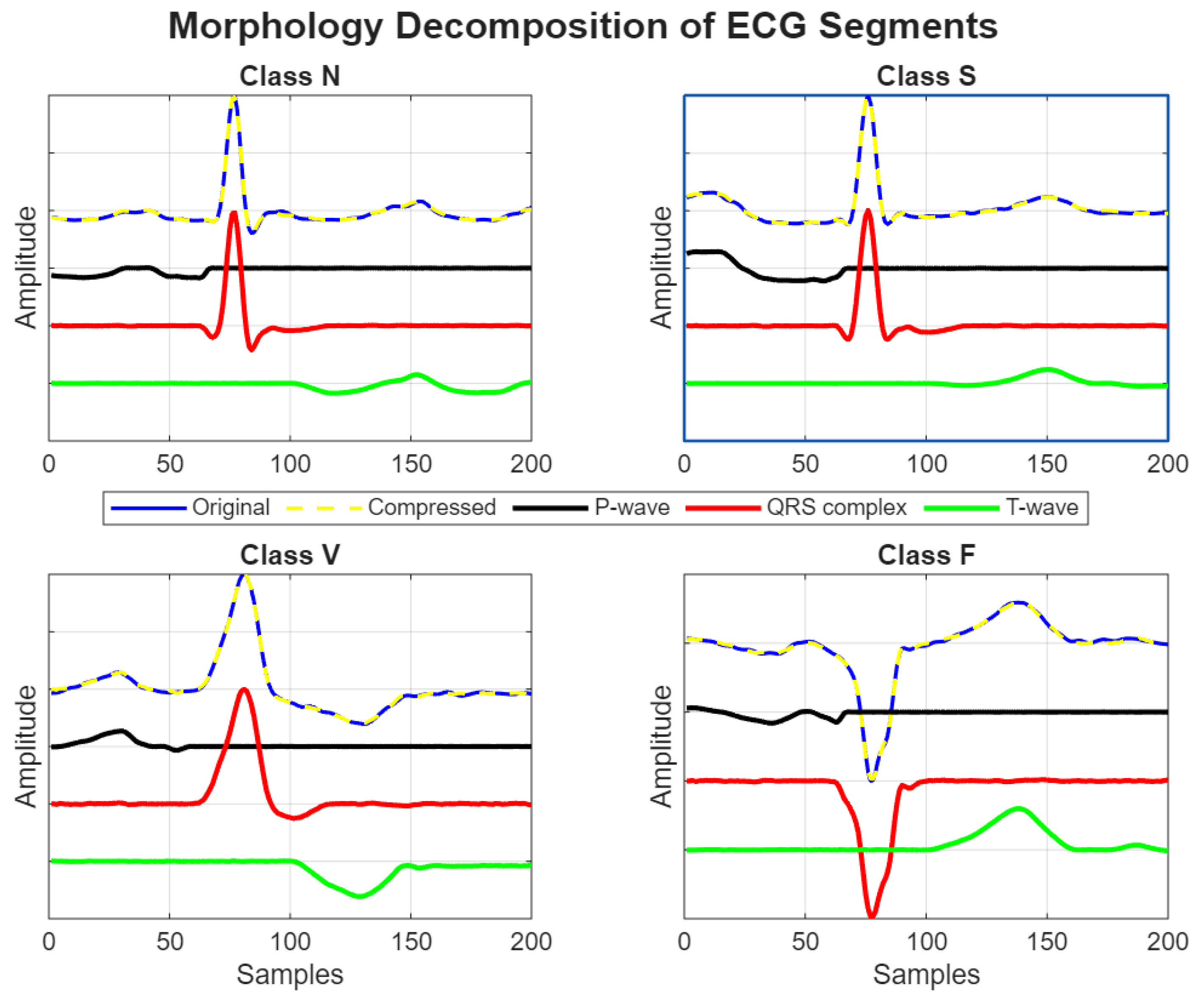 Finally, the proposed framework addresses the challenges of prolonged ambulatory ECG monitoring by offering a unified solution for signal enhancement, compression, and clinically interpretable feature extraction. Notably, the morphological decomposition capability is both highly novel and clinically valuable as it enables accurate identification and temporal localization of individual ECG components, particularly the P-wave and T-wave durations. In addition, we recorded initial indications that separate bases are better suited for representing the P-wave, QRS complex, and T-wave when the time interval between these signal components varies. This capability facilitates precise temporal and morphological analysis, essential for diagnosing conditions such as atrial fibrillation and heart failure.