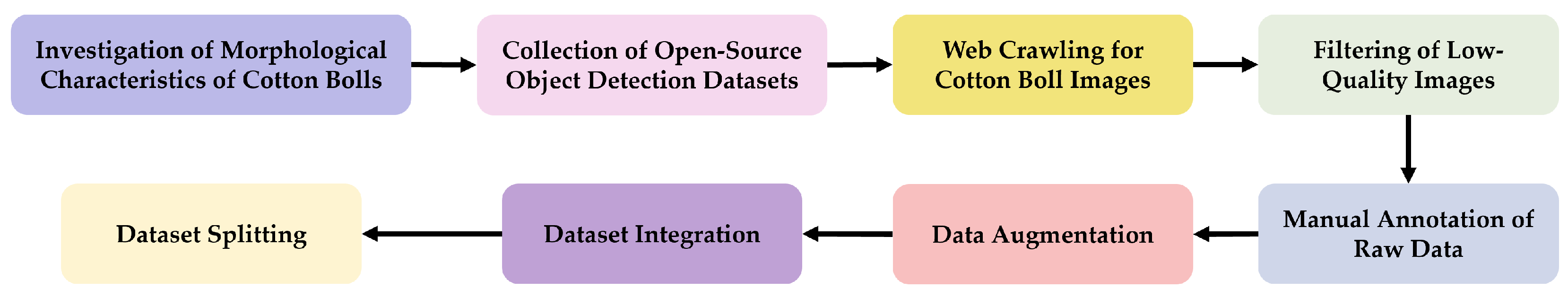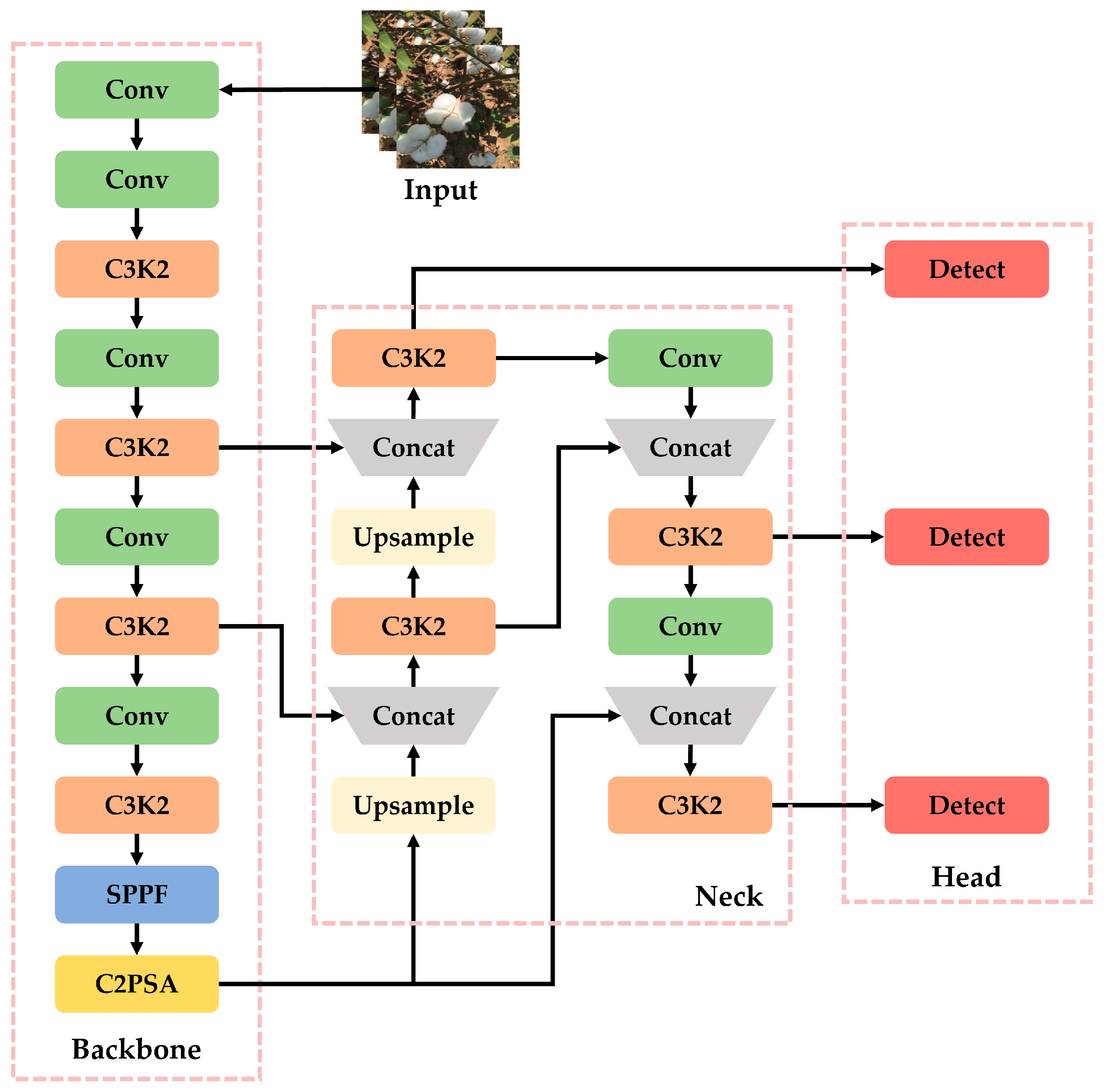 - Xiang, L.; Ruoxue, X.; Chenglong, B.; Min, T.; Mingtian, T.; Kaiwen, H. Lightweight Cotton Boll Detection Model and Yield Prediction Method Based on Improved YOLO v8. Nongye Jixie Xuebao/Trans. Chin. Soc. Agric. Mach. 2025, 56, 130–140. [Google Scholar]