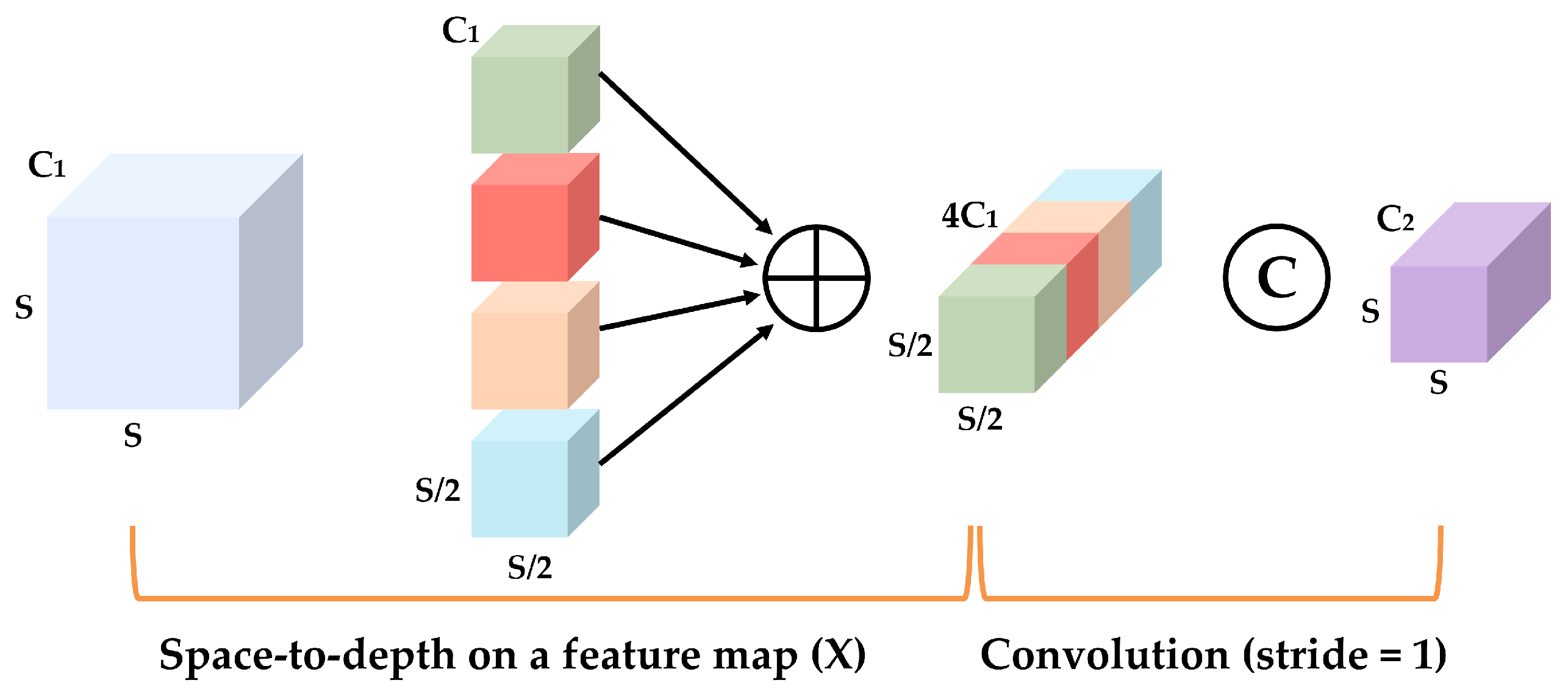 - Sunkara, R.; Luo, T. No more strided convolutions or pooling: A new CNN building block for low-resolution images and small objects. In Proceedings of the Joint European Conference on Machine Learning and Knowledge Discovery in Databases, Grenoble, France, 19–23 September 2022; Springer: Cham, Switzerland, 2022; pp. 443–459. [Google Scholar]
