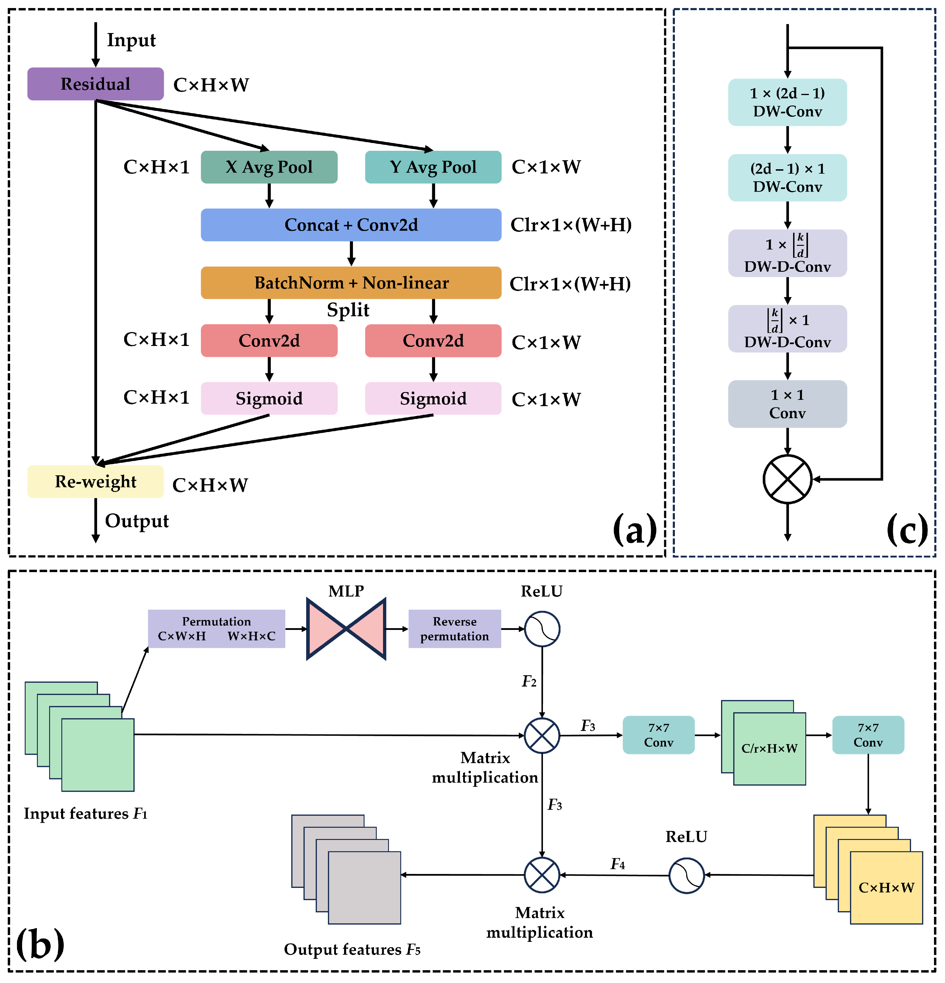 - Hou, Q.; Zhou, D.; Feng, J. Coordinate attention for efficient mobile network design. In Proceedings of the IEEE/CVF Conference on Computer Vision and Pattern Recognition, Nashville, TN, USA, 20–25 June 2021; pp. 13713–13722. [Google Scholar]