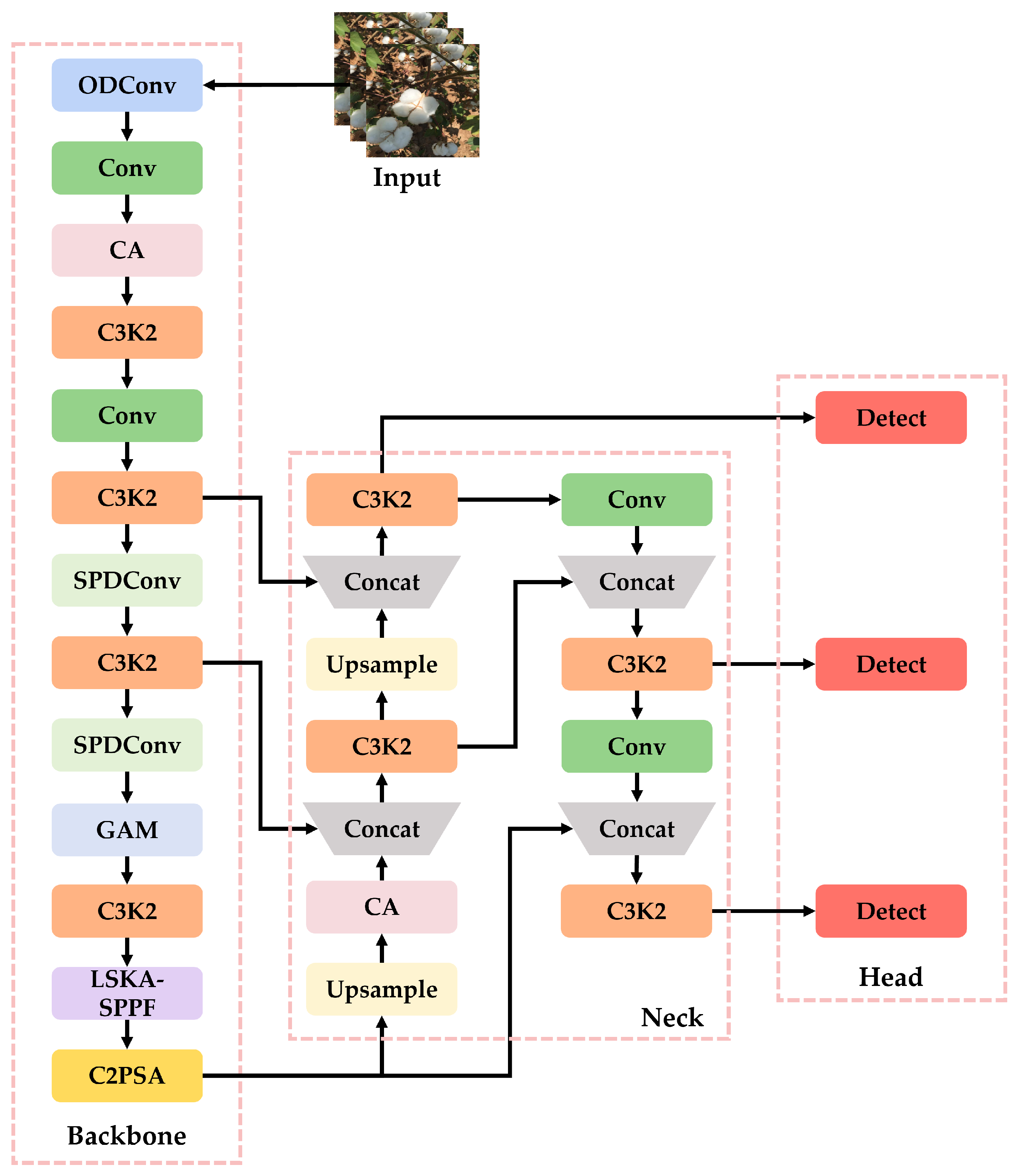 - Proposed ODConv–SPDConv detection framework: To address the rotated, small-scale characteristics of cotton bolls in field scenes, we integrated Omni-Dimensional Dynamic Convolution (ODConv) and Space-to-Depth Convolution (SPDConv) into the architecture for the first time, enhancing multi-angle and multi-scale feature representation and improving detection accuracy in complex environments.