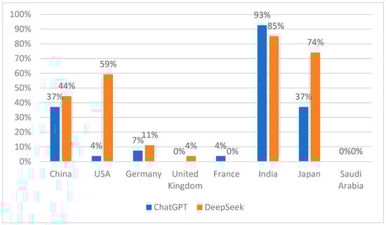Domestic recommendation rates reinforce these contrasts. DeepSeek recommends domestic travel more often overall (34.6% vs. 22.8% for ChatGPT). Examples include USA 59% vs. 4%, Japan 74% vs. 37%. India records the highest domestic emphasis in both models (85% DeepSeek, 93% ChatGPT). France is 0% in DeepSeek and 4% in ChatGPT; Saudi Arabia is 0% in both. The pattern suggests that DeepSeek adopts a more segmented geographic strategy with stronger domestic routing for some origins, while ChatGPT shows tighter regional clusters and lower domestic shares. Figure 1 visualises domestic percentages.