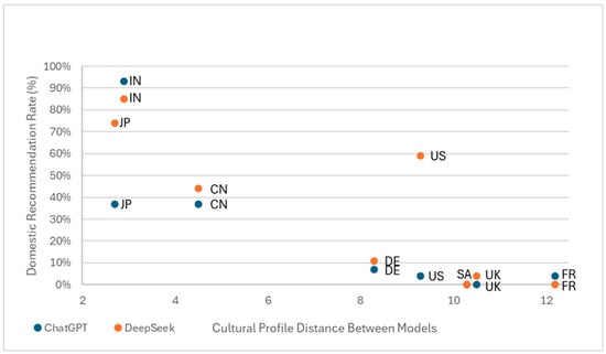 The inter-model six-dimension (6-D) Euclidean distance averages 7.37 across origins (largest: Saudi Arabia ≈ 10.61; smallest: Japan ≈ 2.66). This difference correlates negatively with the domestic recommendation rate (ChatGPT r ≈ −0.76, DeepSeek r ≈ −0.70). When the models’ cultural profiles are closer for an origin (for example, Japan, India), they recommend domestic or culturally proximate destinations more often. When the profiles diverge (for example, USA, France, Saudi Arabia), they tilt toward foreign and culturally distant options. In Figure 2, X-axis is inter-model cultural distance (higher = models disagree more); Y-axis is domestic recommendation rate (higher = more “stay/domestic”). Downward trend means greater disagreement and lower domestic routing.