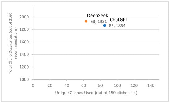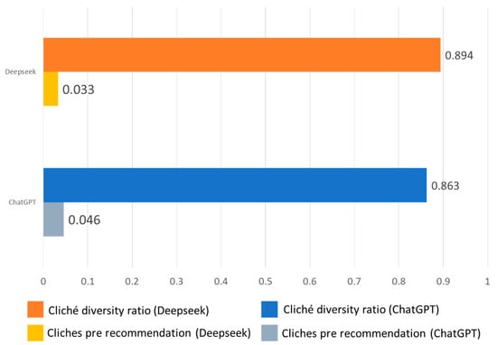 The models differ in lexical diversity versus density. ChatGPT draws on 85 distinct clichés (56.7% of the 150-term lexicon) and reaches a diversity ratio of 0.046 (distinct terms divided by total uses). DeepSeek uses 63 distinct clichés (42.0% coverage) with a diversity ratio of 0.033. In short, DeepSeek is denser, while ChatGPT is more varied. Figure 4 shows the stereotype-bias metric (higher means stronger cliché density) alongside the diversity ratio (higher means more varied language and less reuse).