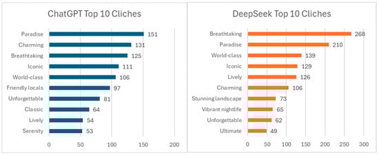 Concentration and leading terms underline the contrast. DeepSeek’s top-10 phrases account for 63.5% of all cliché tokens (1227 of 1931), compared with 52.2% in ChatGPT (973 of 1864). The single most frequent term in DeepSeek is “Breathtaking” with 268 uses (13.9% of all clichés). ChatGPT’s top term is “Paradise” with 151 uses (8.1%). ChatGPT spreads usage over a wider set that mixes idyllic and hospitable frames (“Paradise,” “Charming,” “Iconic,” “Friendly locals,” “Classic,” “Serenity”), while DeepSeek relies more on emphatic superlatives and spectacle (“Breathtaking,” “World-class,” “Iconic,” “Vibrant nightlife,” “Ultimate”). Figure 5 presents the top-10 lists and their shares. Overall, both models operate in a high stereotype-bias regime; DeepSeek is stronger through higher density and tighter concentration, and ChatGPT is more diverse yet still reproduces familiar marketing language.