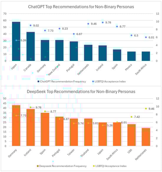 Recommendations vary systematically by gender identity and age, with the largest separations affecting non-binary personas, especially in DeepSeek, and with both models preferentially routing non-binary users toward LGBTI-accepting countries. Symmetric KL divergences between female and male personas are moderate in both models (ChatGPT 1.26; DeepSeek 1.47). Gaps increase sharply for non-binary users. For ChatGPT, female vs. non-binary = 4.87 and male vs. non-binary = 3.96; for DeepSeek, 8.77 and 5.90 respectively. DeepSeek therefore separates non-binary personas from binary personas almost twice as much as ChatGPT. According to Table 9: Female–Non-binary and Male–Non-binary show high to extreme separation (ChatGPT 4.87/3.96; DeepSeek 8.77/5.90), while Female–Male is moderate (1.26; 1.47). DeepSeek > ChatGPT on all gender pairs. Symmetric KL ≥ 0. 0 means identical country mix; higher = greater demographic separation.