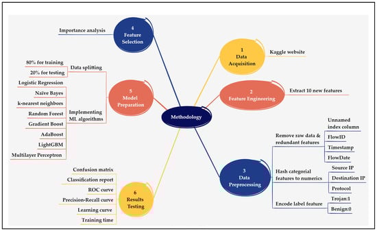 As illustrated in Figure 2, the study approach contains six main stages, beginning with data acquisition and followed by feature engineering and data preprocessing. The final stages focus on enhancing and evaluating the performance using several metrics. To ensure robust performance, the study employed a diverse set of algorithms, including Logistic Regression (LR), Naive Bayes (NB), K-nearest neighbors (KNN), Random Forest (RF), Gradient Boosting (GB), AdaBoost, LightGBM, and Multilayer Perceptron (MLP).