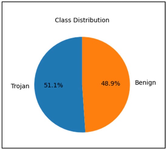 The dataset used in this study was generated by the “Canadian Institute for Cybersecurity (CIC)” and downloaded from the Kaggle website []. It includes 177,482 network traffic records, each representing a flow instance labeled as either benign or a RAT. The dataset distribution is shown in Figure 3.