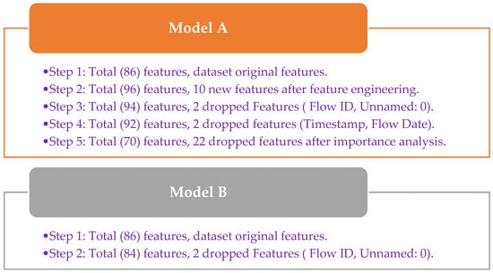 As shown in Figure 4, Model A starts with 86 features. Ten features were extracted through feature engineering, as illustrated previously in Table 1. Four features were dropped, as discussed in Section 2.4. Finally, 22 features were dropped according to importance analysis. As a result, the final number of features in Model A is 70 features, including the label (Trojan, benign). The retained set included a mix of original network features, derived behavioral features, and key host indicators that were empirically validated to contribute significantly to the classification task. This selective pruning of the feature space not only improved training efficiency but also helped mitigate overfitting, as the models were now trained on the most informative subset of data. Model B has 86 features too; 2 features were dropped as discussed previously in Section 2.4. As a result, the final number of features in Model A is 70 features, including the label (Trojan, benign).