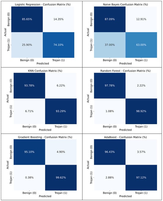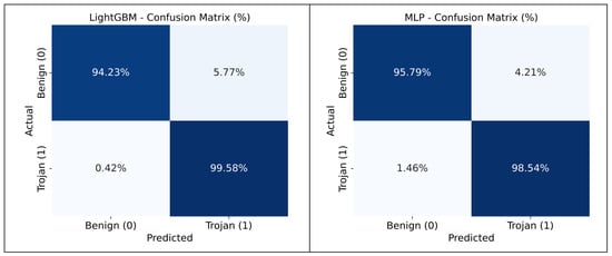 As shown in Figure 5, the Logistic Regression correctly predicted 86% of benign flows and 74% of Trojan flows. The Naïve Bayes classifier achieved 87.17% accuracy for benign traffic and 64.17% for Trojan traffic. In contrast, the Random Forest classifier correctly predicted 98% of benign samples and 99% of Trojan samples. The Gradient Boosting, AdaBoost, LightGBM, and MLP models were able to predict the Trojan traffic with accuracies of 99.62%, 97.12%, 99.58%, and 98.54%, respectively.