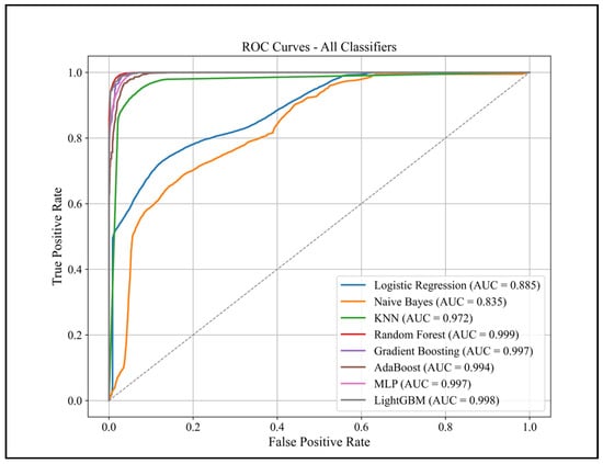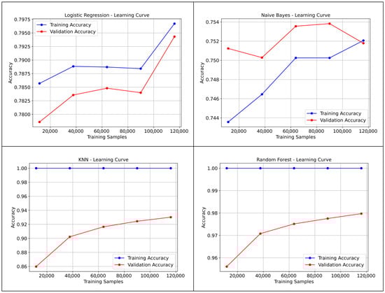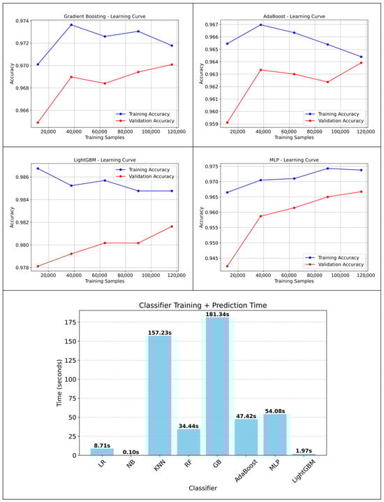 As shown in Figure 8, Random Forest and Gradient Boosting demonstrated steadily increasing validation accuracy as training data increased, closely following their training accuracy. AdaBoost and LightGBM also showed consistent performance, with validation curves staying near their training curves across all data sizes. The MLPClassifier consistently had a small gap between training and validation accuracy. Logistic Regression reached early convergence, with nearly identical training and validation curves, while Naïve Bayes displayed more variation in validation accuracy. K-Nearest Neighbors maintained high training accuracy, with validation improving gradually as the data size expanded. The training times in seconds were LightGBM (1.79 s), Logistic Regression (8.71 s), Naïve Bayes (0.10 s), k-Nearest Neighbors (157.23 s), Random Forest (34.44 s), Gradient Boosting (181.34 s), AdaBoost (47.42 s), and MLP (50.08 s).