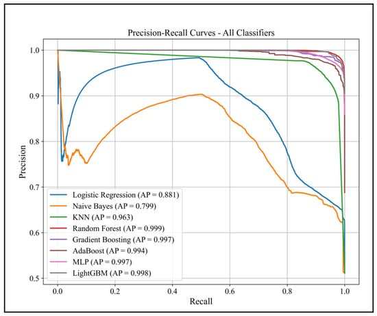 The Precision–Recall (PR) curve is a diagnostic tool that focuses on the performance of a classifier concerning the positive class (Trojan traffic) []. The curve displays precision against recall at various threshold values. PR curves are exceptionally informative when dealing with imbalanced datasets, as they provide more meaningful insight than ROC curves when the positive class is rare. Figure 7 shows the PR curves for the same set of models evaluated in the ROC curve analysis.