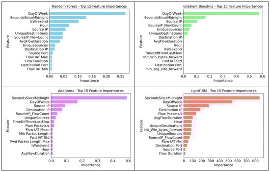As shown in Figure 9, “DayOfWeek” and “SecondsSinceMidnight” were the most significant features across all classifiers. For Random Forest, the most important features were “IsWeekend, Hour, and Source IP”. For Gradient Boosting, the top features included “Source IP, SourceIP_FlowCount, and UniqueSources”. The AdaBoost model highlighted “Source IP, Destination IP, and SourceIP_FlowCount”, while LightGBM identified “Source IP, Destination IP, and Flow Packets” as the key contributors.