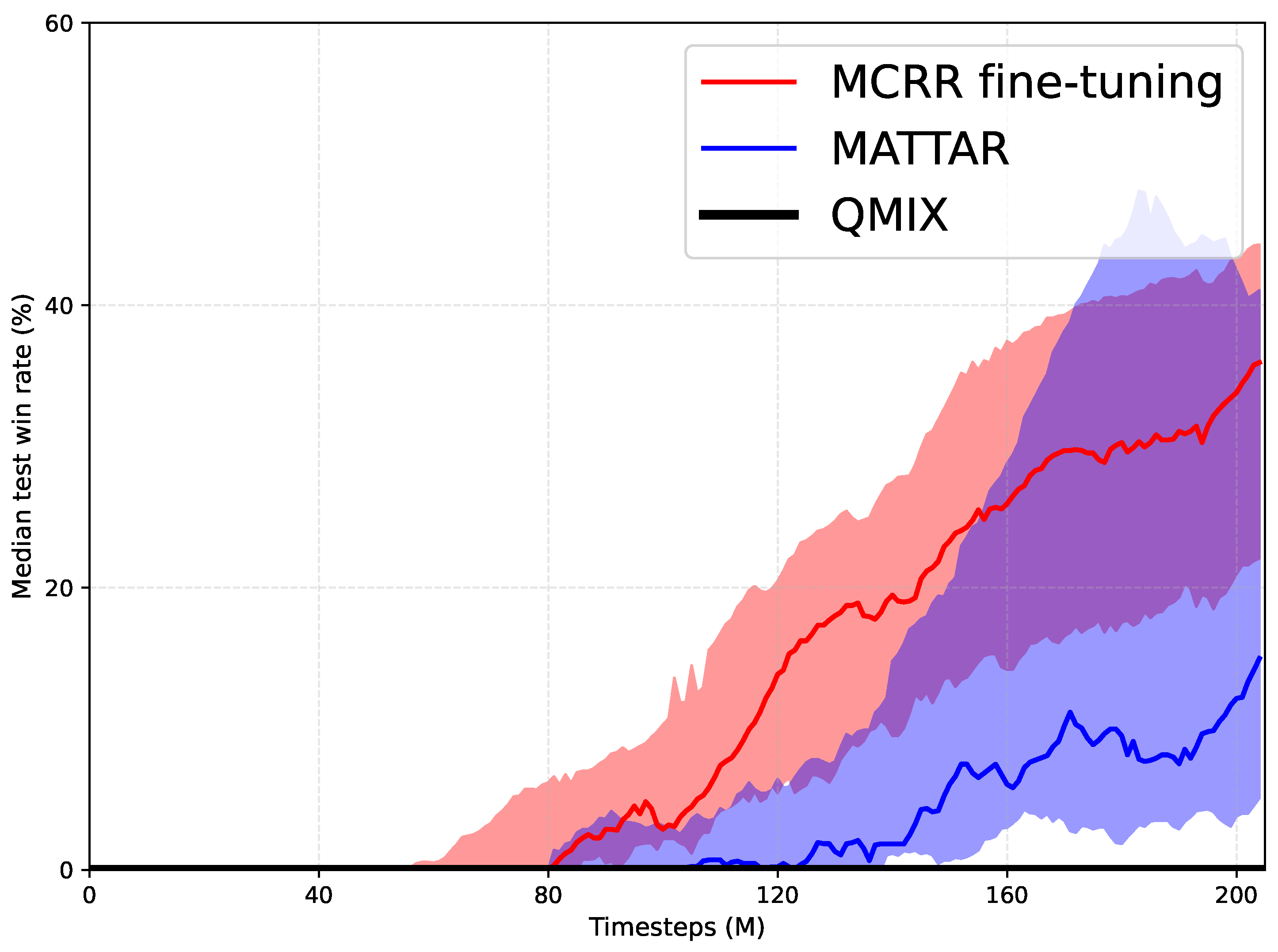 | 3s5z | 1.00 ± 0.00 | 0.96 ± 0.04 | 0.99 ± 0.01 | 0.86 ± 0.13 | 0.47 ± 0.15 | 0.43 ± 0.13 | |