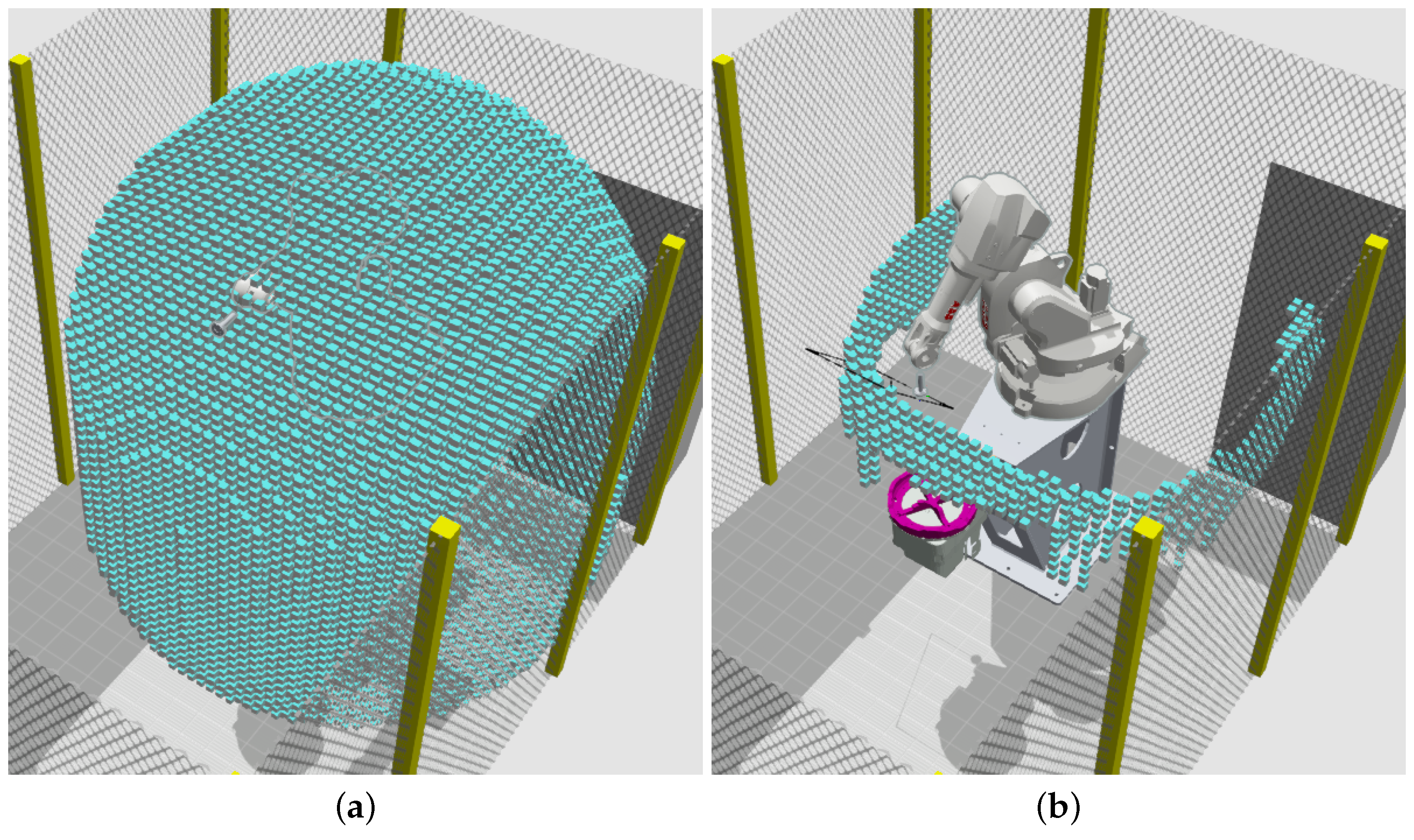 Figure 5) removed most configurations that violated basic kinematic or reachability constraints, reducing the initial set to 794 positions. Although the robot kinematic parameters and collision volumes are defined in the custom software, this coarse filtering stage is intentionally conservative (i.e., tuned to avoid discarding potentially feasible configurations) and does not capture all robot and controller-specific execution constraints; therefore, a small subset of the filtered work object positions may still be infeasible for the real robot. The remaining positions were then validated in RobotStudio using the RAPID-based reachability and trajectory-check routine presented in