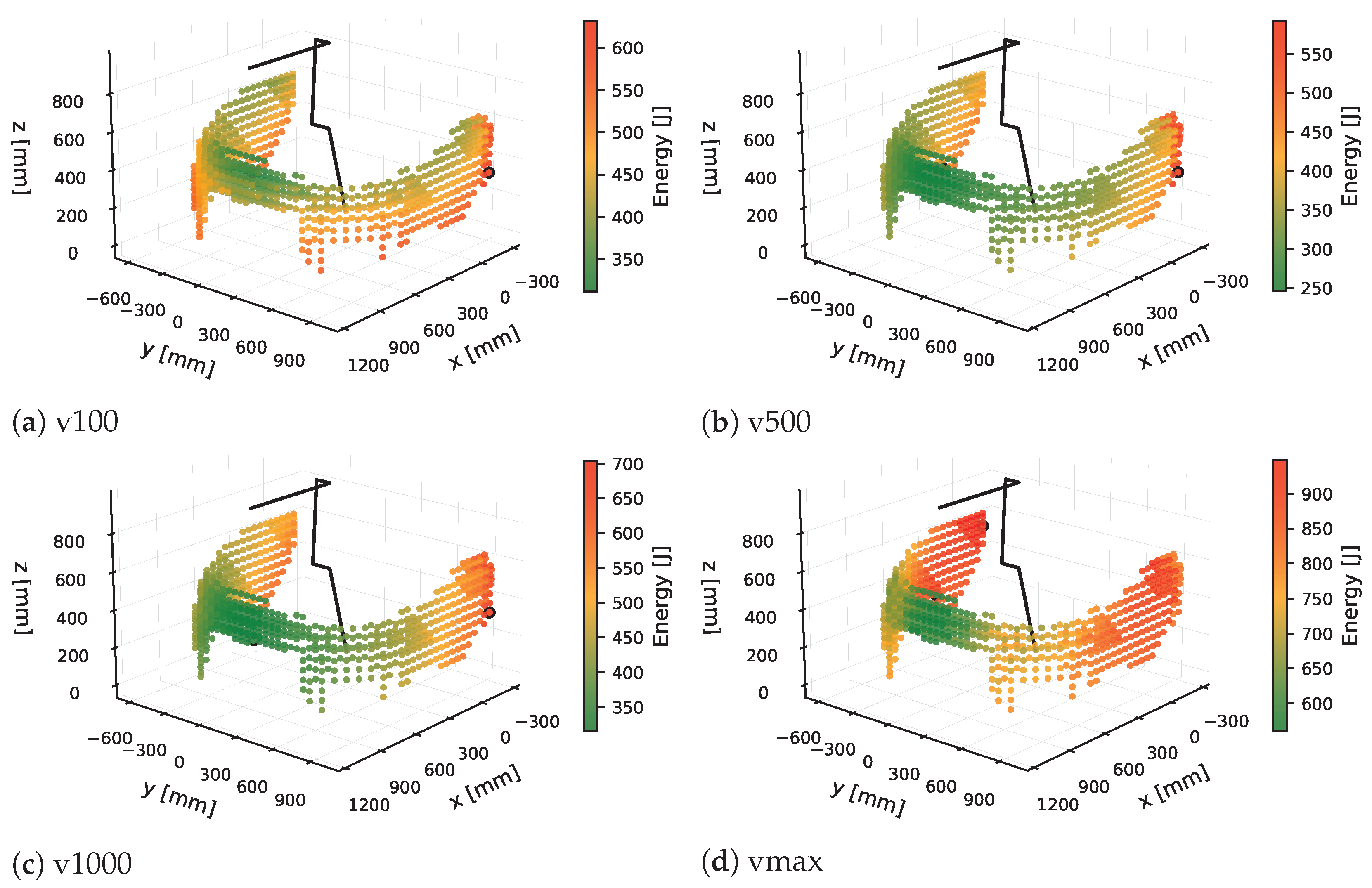 To assess whether the spatial energy distribution exhibits systematic differences across different motion conditions, the simulations were executed at four programmed speeds. The resulting three-dimensional energy maps for v100, v500, v1000, and vmax are shown in