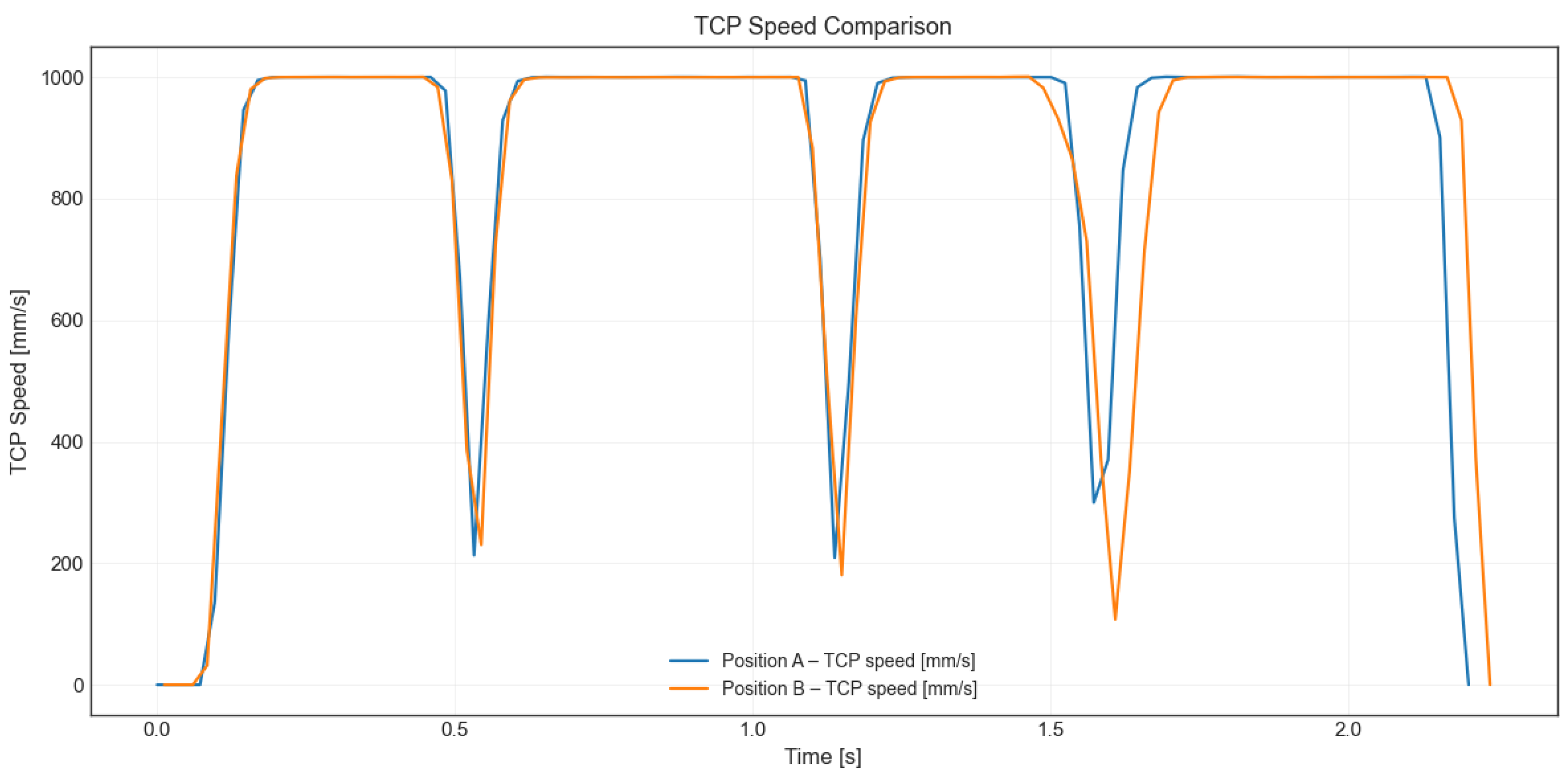 Figure 10, the same programmed trajectory was executed in both cases; however, the robot temporarily reduced its TCP speed at several trajectory transitions in one of the configurations. These brief slowdowns reflect geometric effects along the trajectory, where some transitions are traversed slightly more slowly due to less favorable joint postures.