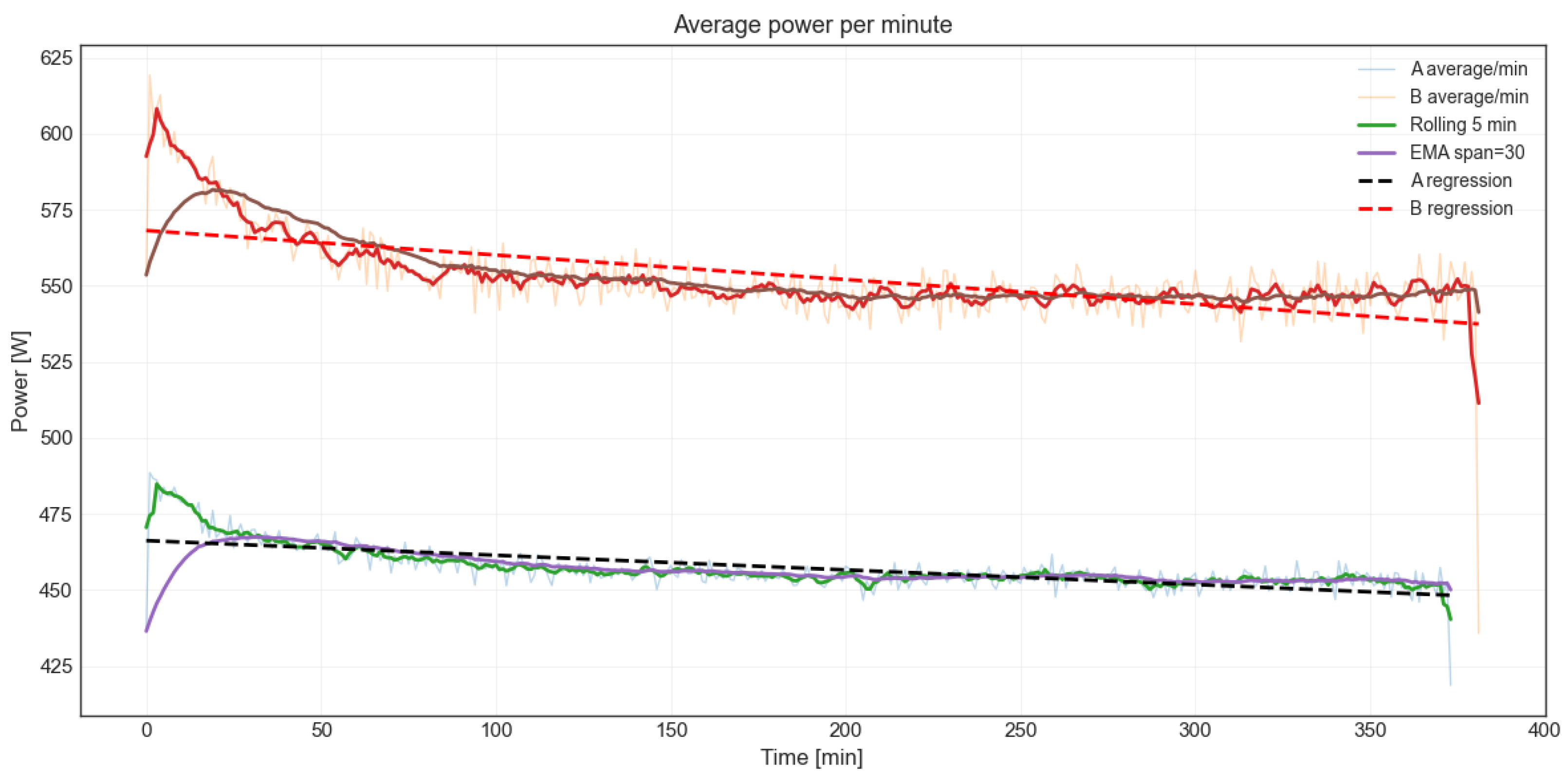 Long-term temporal trends were also consistent with this observation. Both measurements exhibited a mild negative power drift over time, commonly associated with thermal stabilization of the mechanical structure and drivetrain. However, Configuration B showed a more pronounced decline, reflecting its initial higher load and a more intensive warm-up phase (see