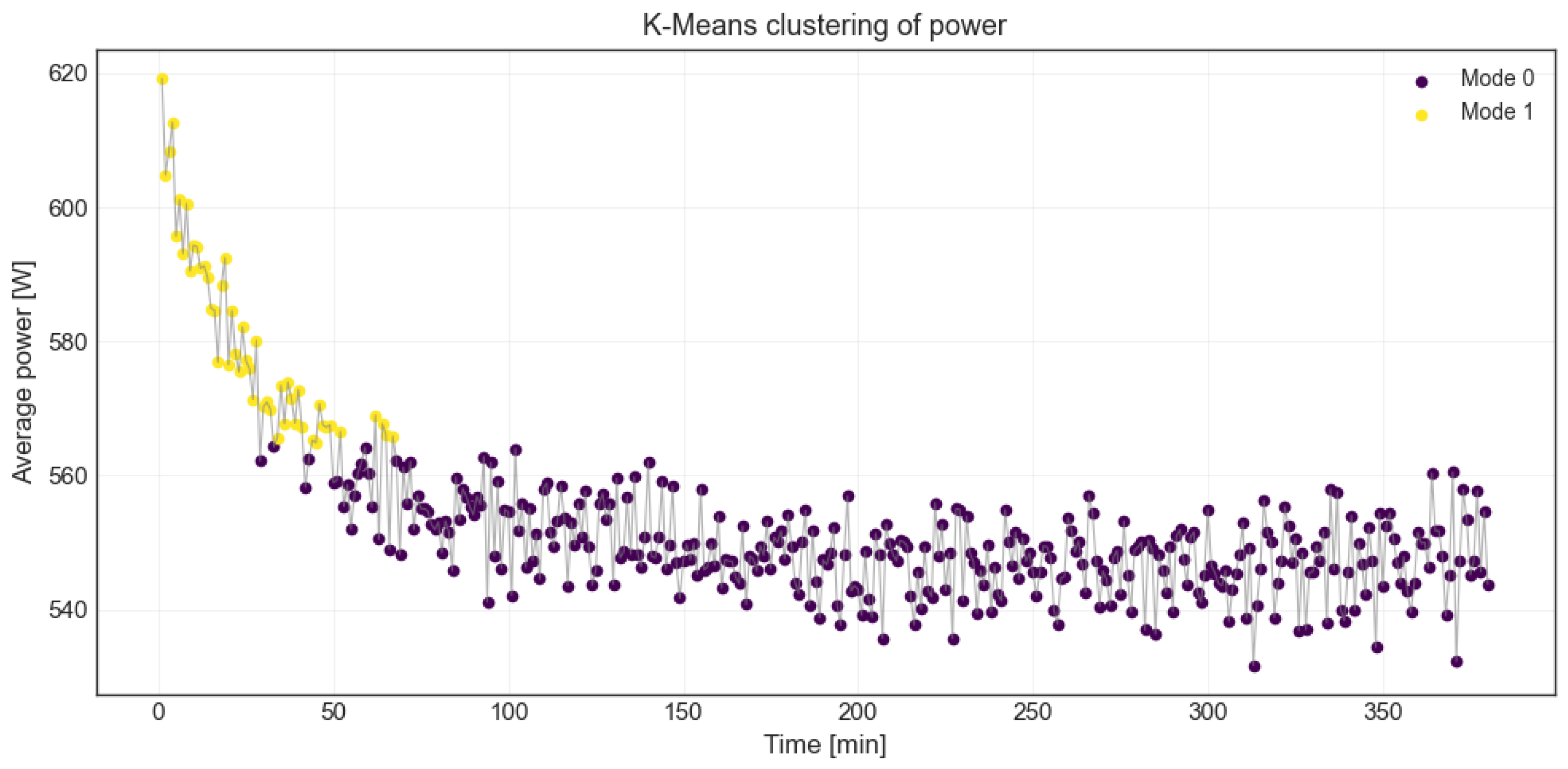 Figure 12). Clustering of the power signal into operational regimes further confirmed these differences: while both configurations contained distinct warm-up and steady-state phases, configuration B reached its stable regime more rapidly but at considerably higher power levels, remaining energetically less efficient throughout the majority of the experiment.
