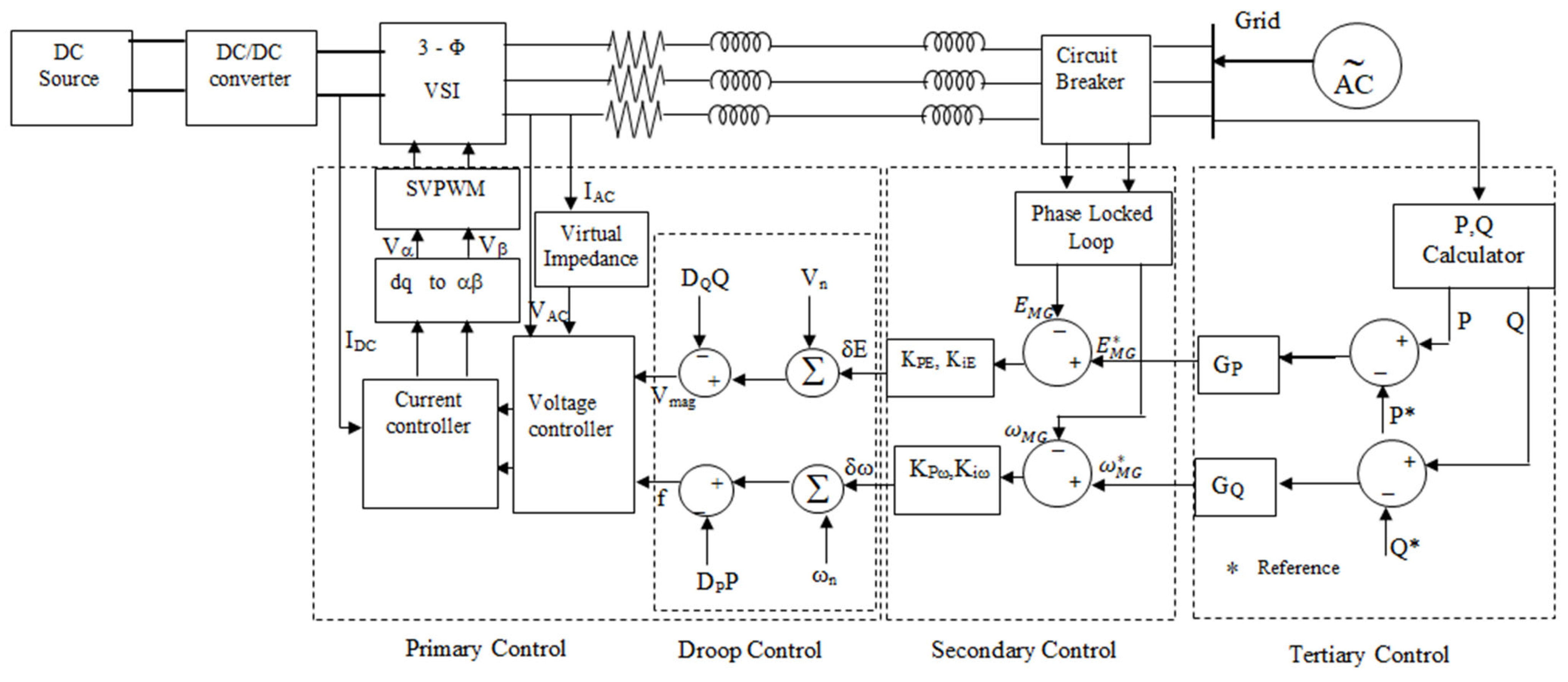 Primary control is implemented to achieve a balance between the required voltage regulation and power sharing at the expense of each other. The primary control leaves a steady-state error, which is fixed by the secondary control. Various secondary control methods are shown in