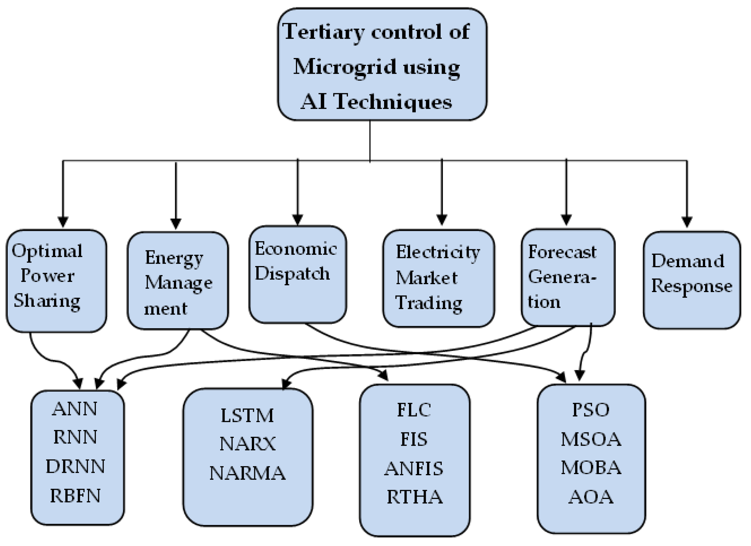 118]. Tertiary control may be centralised or decentralised, based on requirements. In the centralised control, the microgrid central controller (MGCC) manages the aforementioned activities, that is, optimises microgrid operation, manages power exchange with the main grid, and provides set points for secondary control. The implementation of these intelligent techniques for the MGCC is the need of the hour, as the time frame available is on the higher side, and hence, more possibilities can be explored to reduce the time.