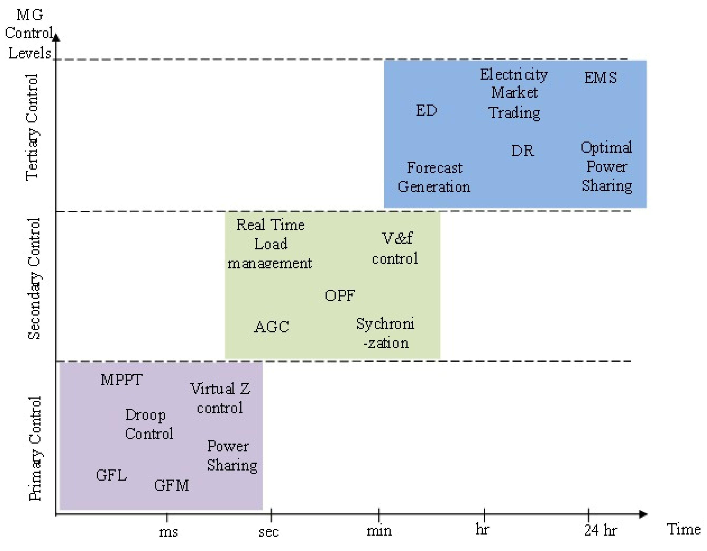 Section 2, this control action is initiated by the LCs at the terminals of the interfacing converter (either grid or load). Primary control is applied to supply the required load with existing power generation and storage while maintaining voltage and frequency deviations within prescribed limits by controlling local variables, such as voltage, frequency and current injection. This is achieved using appropriate controllers. During islanded operation, microgrids operate in autonomous mode to increase the reliability of the system. Hence, their time level is the fastest compared to other levels and includes islanding detection, active and reactive power sharing and successive changes in control modes. Although there are several ways to implement this primary control as mentioned in