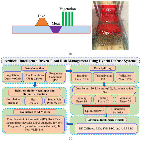Detail of hybrid defense system comprising dike, moat, and vegetation and data collection integrated in this study using different parameters, including energy dissipation, flow, vegetation, and roughness conditions (a) definition of hybrid defense system consisting dike, moat, and vegetation (b) flowchart of methodology adopted in this study depicting data collection, relationship between Fr, Ke, G/d, Δh/ho, and energy dissipation, data splitting, and evaluation of different models.
