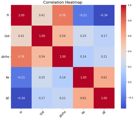 Visual direction and strength of relationship between input (Fr: Froude number, G/d: vegetation density, Ke: roughness, and Δh/ho: relative backwater rise) and output (ΔE: energy dissipation) parameters using correlation heatmap.