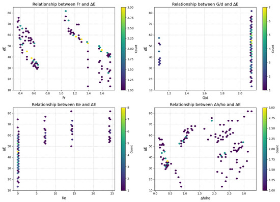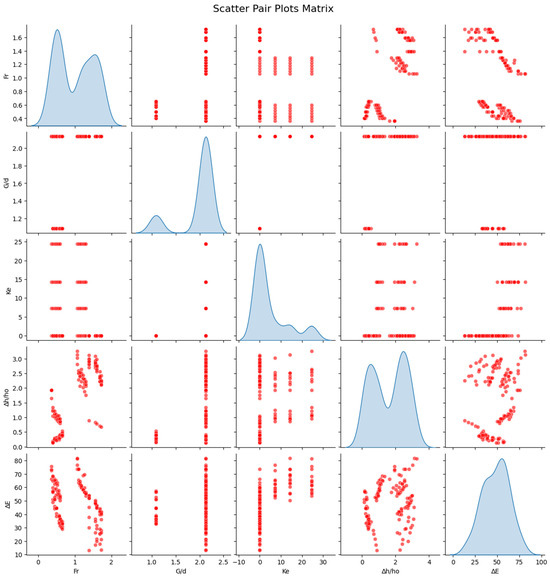The hydrodynamic interactions between flood and hybrid defense system-related variables are visualized by a scatter pair plot, as shown in Figure 4. In this section, a detailed assessment of this relationship is explained. A relationship between Fr and ΔE demonstrates that intense flow conditions minimize the effectiveness of hybrid defense to reduce floodwater energy dissipation. At higher values of Fr, the impact of the hybrid defense system on floodwater is reduced by the dominant flow momentum. Hydrodynamically, this is attributed to the bypassing of vortical structures and minimization of the exchange of energy with boundary elements to resulting reduced amount of turbulence-induced dissipation [80,81]. The weak scatter relationship of vegetation density (G/d) with ΔE depicted in the scatter pair plot indicates a lower influence of the G/d on floodwater energy dissipation. This may be due to the selected vegetation conditions, i.e., sparse and intermediate arrangement, which provides lower resistance to the flow compared to a dense arrangement of the vegetation. However, the sparse and intermediate vegetation arrangement also dissipates floodwater energy by the impact of drag, localized turbulence, and formation of a wake, improving the energy dissipation capability of the vegetation. The non-linear distribution, however, is representative of the multidimensional interactions that include vegetation density and reorganization of flow. At low to moderate G/d, there is increased turbulence due to wake interactions, vortex shedding, and greater density can lead to flow channelization; hence, there is less energy dissipation.