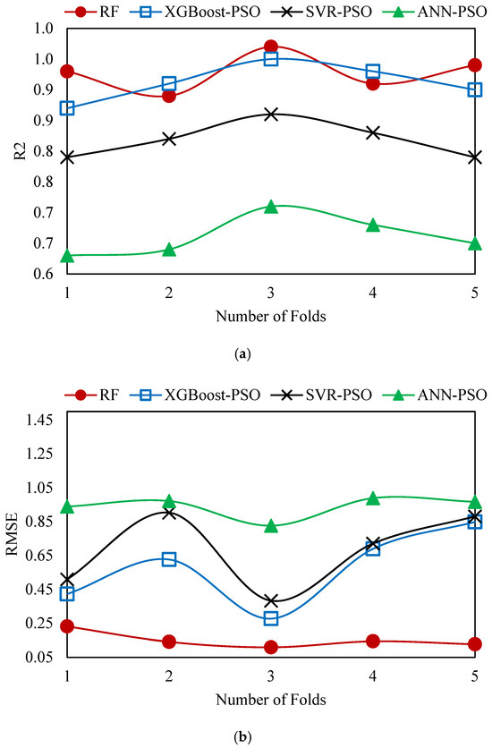 Model Optimization through 5-fold cross-validation: (a) coefficient of determination (R2) and (b) root mean square error (RMSE).