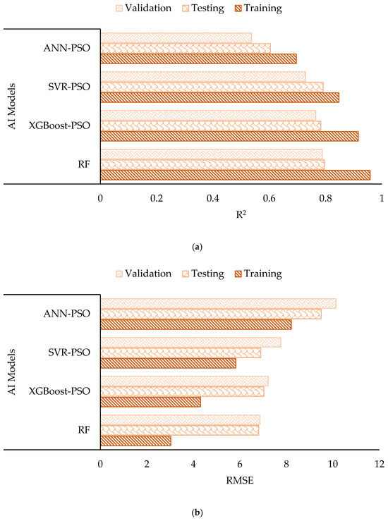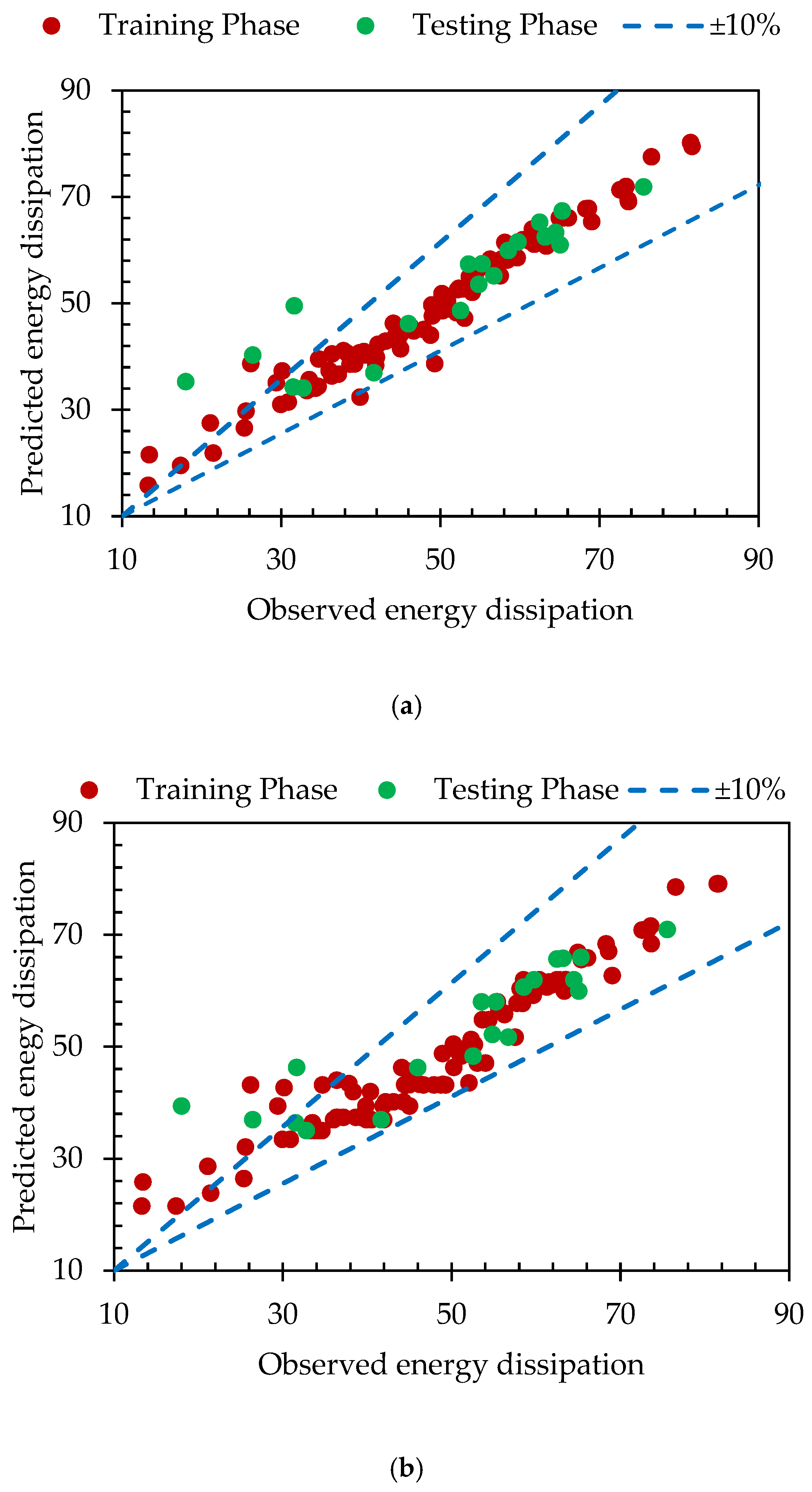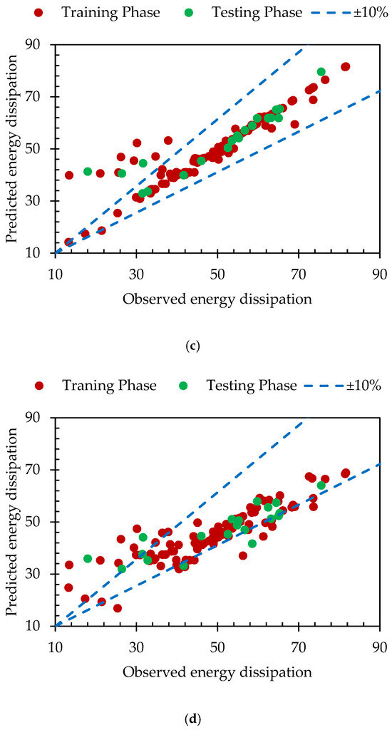 Under this heading, a detailed evaluation of the four different tested models is conducted to understand the predictive capability of each model in flood risk management using a hybrid defense system, as shown in Figure 7a,b. The evaluation of each AI model was assessed through the coefficient of determination (R2) and root mean square error (RMSE). However, in this section, the performance of each model is explained one by one for a clear understanding. The performance of each model was assessed by considering R2 and RMSE values in the training phase. Out of the four models, the RF outperformed because of the greater R2 and lower RMSE values of 0.958 and 3.03 (Figure 7a,b). The result demonstrated 96% of variance in the data series in the training phase of the model. However, the R2 and RMSE values of the RF models drop in the testing and validation phases to 0.796, 0.788, 6.81, and 6.86. The higher values of R2 and RMSE in the training phase indicate better performance of the RF model compared to the testing and validation phases. The RF model struggles with unseen data series for generalization, reflected in the RMSE values in the testing and validation phases. Despite this, the RF model provides a good prediction of floodwater energy dissipation across different phases.