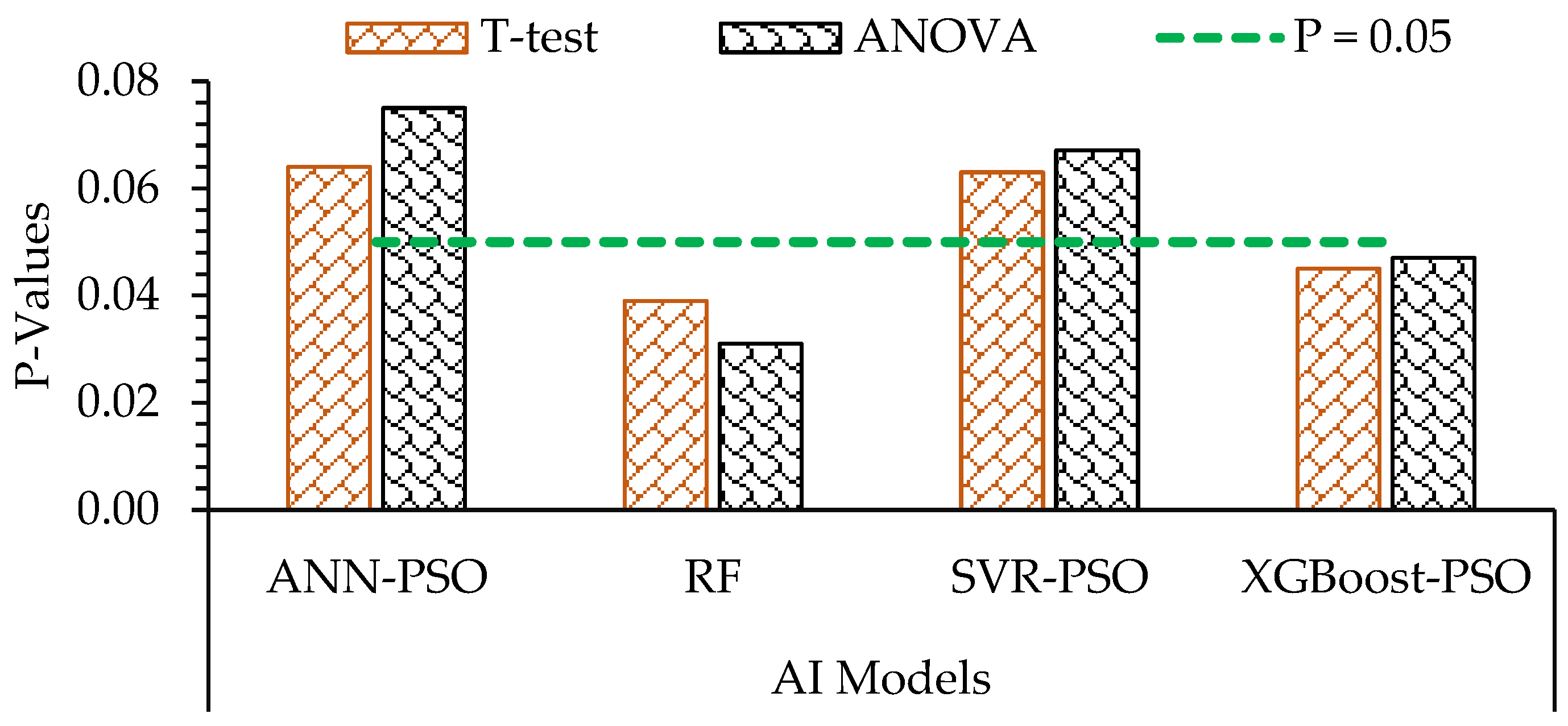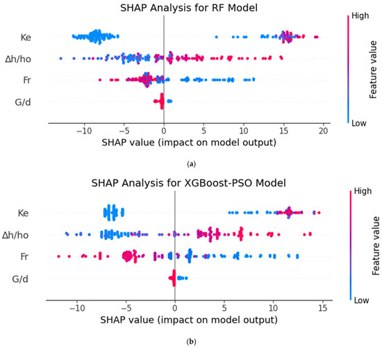 In this study, for predicting floodwater energy dissipation, a detailed analysis of the optimizing model parameters through a five-fold cross-validation technique was performed utilizing four different ensembled learning models, demonstrating limitations and robustness of each model, as shown in Figure 6a,b. Among the tested models, RF demonstrated significant predictive performance with R2 and RMSE values ranging from 0.89 to 0.97 and 0.10 to 0.23, respectively. The high R2 and low RMSE suggest that the model effectively captures nonlinear hydraulic interaction while reducing overfitting through ensemble averaging. Such performance indicates the ability of the RF model to capture nonlinear hydraulic processes and reduce overfitting through ensemble averaging. XGBoost-PSO was also competitive with the highest single-fold accuracy (R2 = 0.95) but with greater variability in RMSE (0.277–0.849), which suggests that it is sensitive to data partitioning. The high RMSE values of some folds indicate that XGBoost-PSO is capable of capturing complicated patterns of the flows; however, its boosted tree operator might enhance the error of a fold with slightly different flow patterns or energy dissipation states. In SVR-PSO, moderate predictive power was found with a range of R2 values (0.79 to 0.86), although the relatively large RMSE (0.38 to 0.90) indicated that it had challenges in capturing nonlinear interactions of turbulence, velocity, and depth in dissipating energy. Among the tested models, the ANN-PSO showed comparatively lower performance, whose R2 values only going up to 0.71, and RMSE values remained consistently high (0.82–0.98). This pattern is likely due to limited data density, as neural networks generally require large datasets for reliable generalization. A known limitation of ANN models is their reduced performance when trained on small datasets, which is often the case in hydraulic laboratory experiments and field measurements.