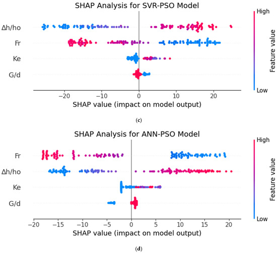 Previous research reported that ANNs work in a similar way to the human brain by simulating signals through input, hidden, and output layers [28,68]. The architecture of the ANN model developed in this study comprises two hidden layers with epochs and learning rate as summarized in Table 5. However, conventional ANN models find it difficult to provide a precise prediction of the hydrodynamics phenomenon. Therefore, to optimize the predictive capability of the conventional ANN model, PSO was employed in combination with the ANN model. PSO, inspired by the flocking behavior of birds, optimizes ANN weights and biases to minimize prediction error. PSO has been employed with 10 particles, 10 iterations, and parameters were c1 = 0.5, c2 = 0.3, and inertia weight w = 0.9. After identifying the best solution, the final ANN was trained on Adam as the optimizer and as well as the mean squared error. Using PSO, the ANN was provided with the advantage of both robustness and adaptability and has proven to be useful in modeling nonlinear and complex relationships within hydrodynamic processes. Furthermore, PSO is considered a population-based global optimizer that helps in reducing local minima and is greatly recommended for the optimization of ANN, SVR, and other AI models under nonlinear hydraulic applications, as studied by [69,70]. In the present research paper, the architecture of the ANN model was fixed before the training phase, and PSO was utilized for hyperparameter optimization, including weight initialization seeds, learning rate, and other parameters. Therefore, in this study, PSO was used to improve the convergence of the model and stabilize the predictive capability of the ANN model. Therefore, these advantages of the PSO in comparison to the Adam optimizer, in this study, PSO-based optimization was utilized to enhance the predictive capability of the tested model for different scenarios of flood risk management. Moreover, the complex and nonlinear hydraulic interaction without an issue of overfitting, prior studies reported that the ANN model with more than one hidden layer provides robust results under medium data points [71,72]. In this study, a two-hidden-layer ANN model was selected to understand the complex hydraulic phenomenon and the balance between model generalization.
