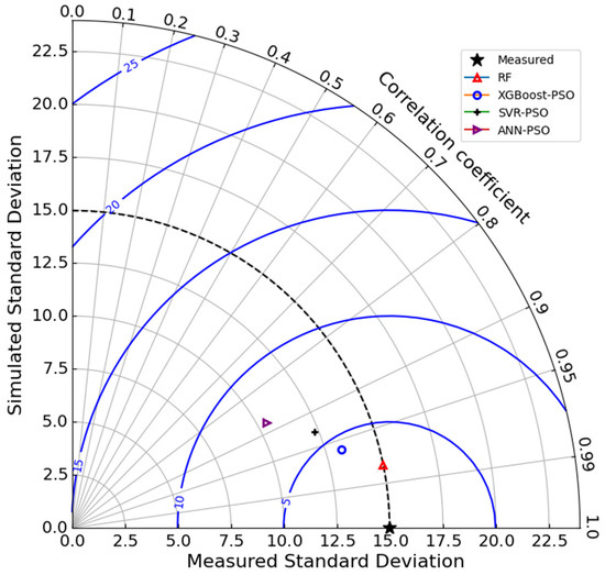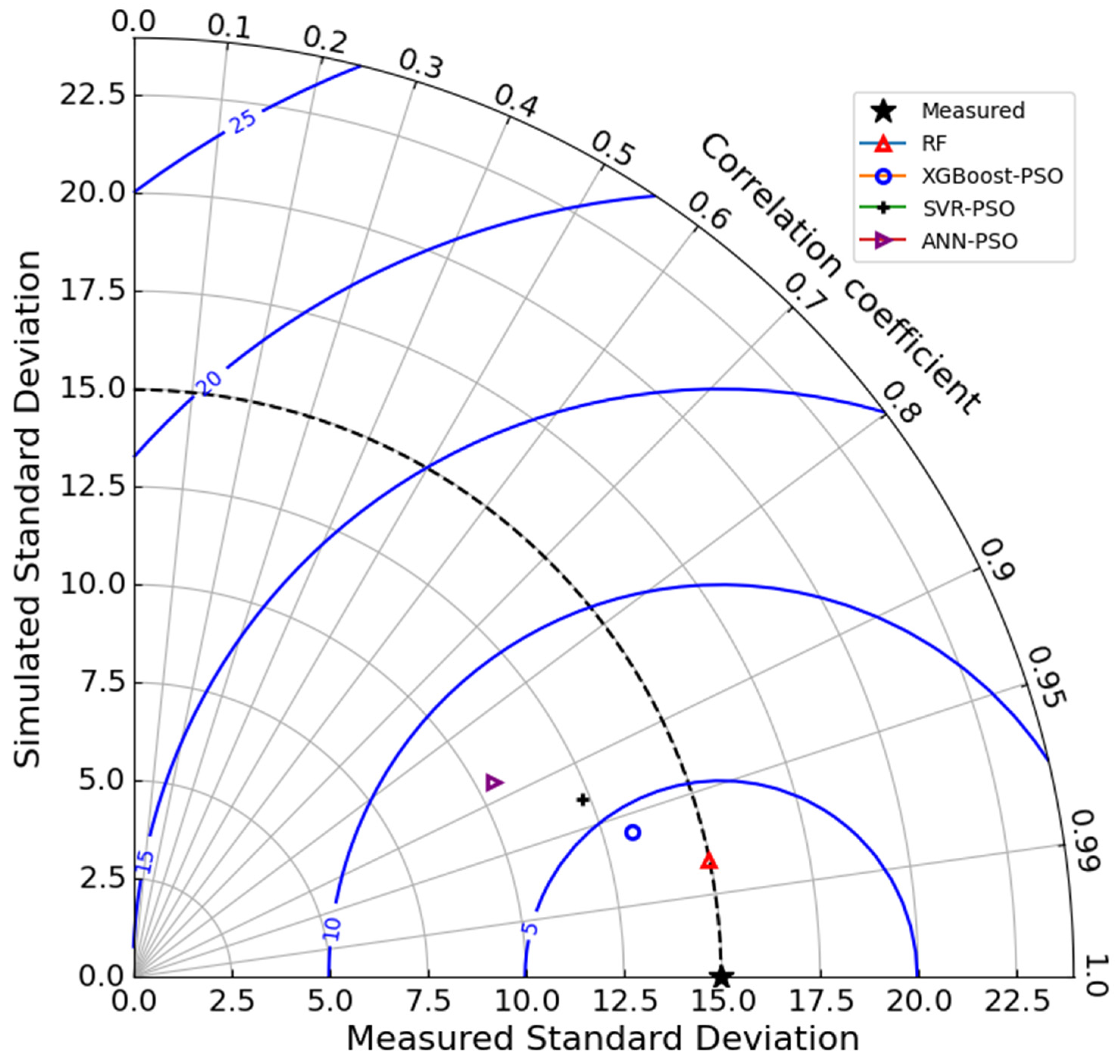 Support Vector Regression (SVR) is a machine learning-based regression algorithm utilized for performing a task that allows error margins up to certain limits by best fitting the data series. However, a standard SVR model struggles in prediction through a large data series of high complexity and noise. This model also needs careful consideration of parameter tuning and may be expensive in computation to train a large data series. Therefore, in this study, a hybrid SVR-PSO model was developed by mapping a relationship between input and output parameters as summarized in Table 5. For this purpose, to develop an SVR model with a radial basis function (RBF) kernel was utilized because of its significance in capturing the complex dependency of the output variable on input variables. The optimization of key hyperparameters such as the regularization parameter (C), epsilon (epsilon), and the kernel coefficient (gamma) was achieved using PSO. C between 0.1 and 1000, epsilon between 0.01 and 0.1, and gamma between 0.01 and 1 were defined as the search space. A potential set of parameters was encoded into each particle, and its fitness was measured by training the SVR model on the training set and computing the test MSE. The swarm size was 10 particles, and its iterations were 10, c1 = 0.5, c2 = 0.3, and w = 0.9 in balancing exploration and exploitation. Upon receiving optimal parameters, the final SVR model was trained and tested in groundwork on train, test, and validation partitions. The model performance was evaluated in terms of R2 and MSE.