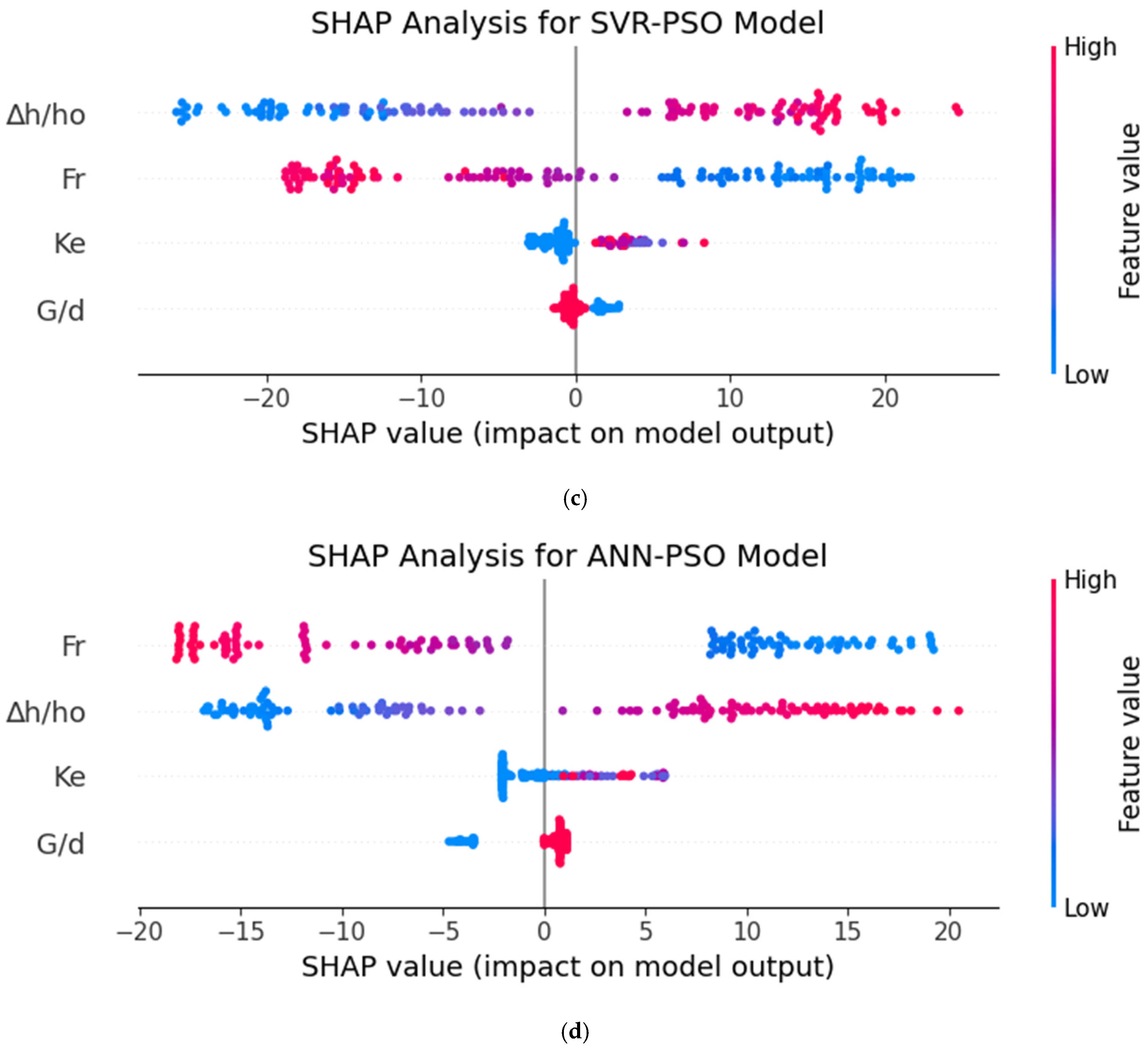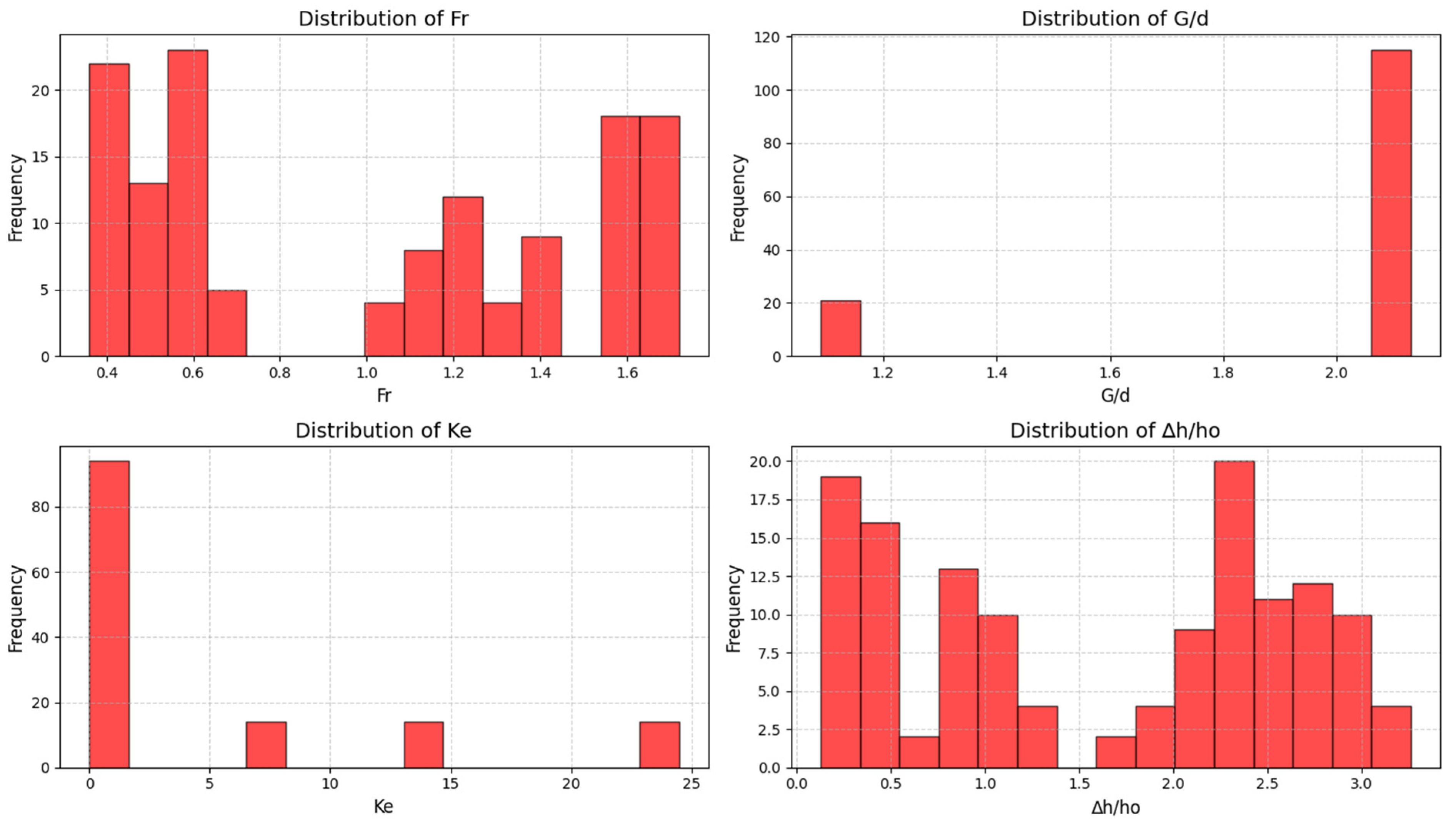 These distributions demonstrate that vegetation density and roughness are the major factors that determine the results of energy dissipation. Highest values of G/d, indicating the clear importance of vegetative resistance in flow regulation, which is consistent with [78], who pointed out drag and the generation of turbulence by different configurations of vegetation. Similarly, the Ke values imply that minimal and moderate roughness may contribute to the turbulence and energy loss to a great extent, in line with Zhang et al. [79]. Bimodal distribution of Fr substantiates that variable flow regimes have a direct impact on backwater effects and on turbulence. The distribution of Δh/ho shows that the hydraulic response is not homogeneous, thus proving again the necessity of hybrid defenses to have the benefits of both vegetation and roughness factors. These results confirm that artificial intelligence models have promised to identify nonlinear trends and optimize the strategies of dealing with flood risks by taking into consideration various interactions between parameters.
