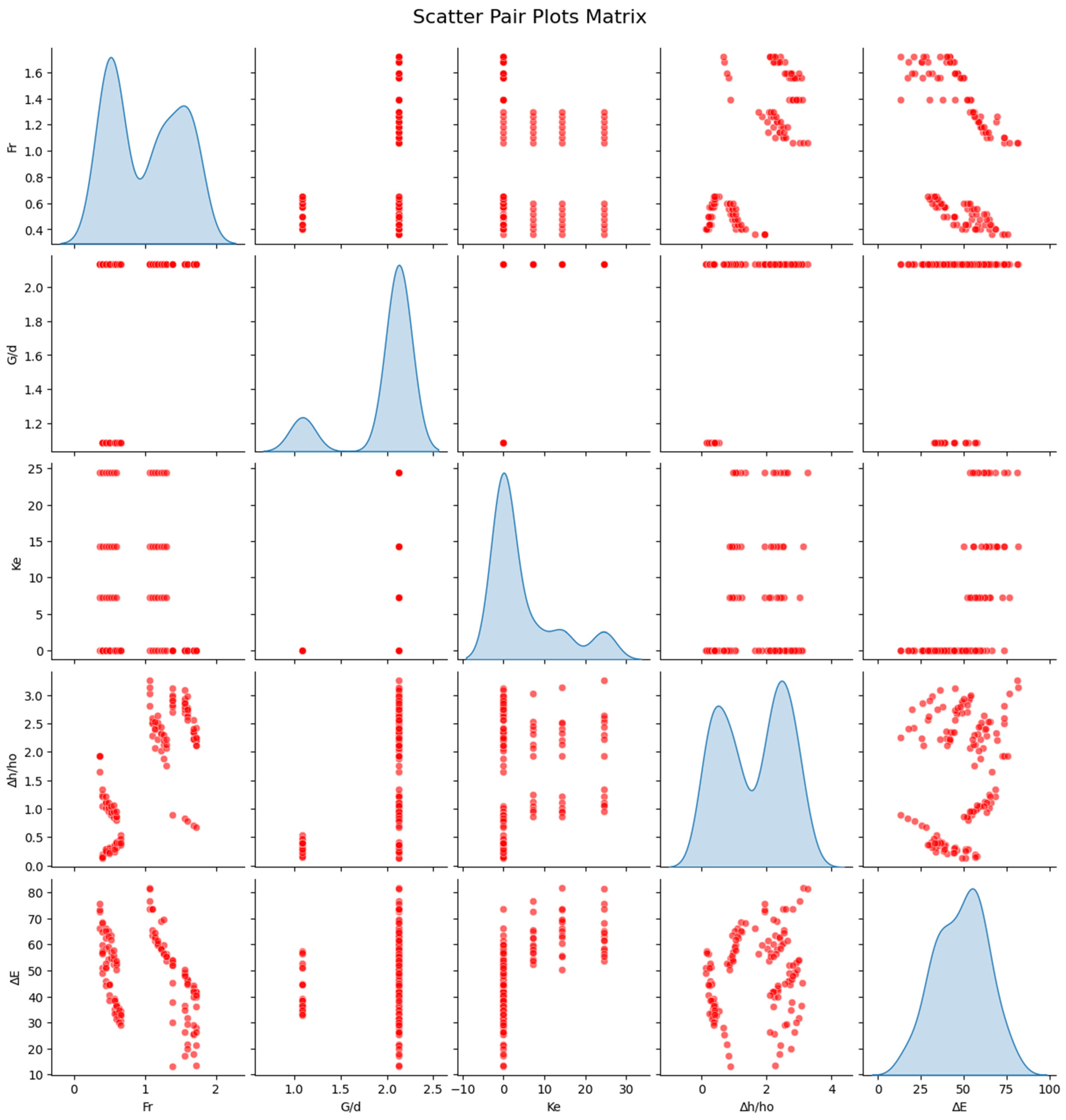 Pairwise relationships among studied parameters indicate the linear and nonlinear relationship between pairs of (input–input and input–output) parameters, including Fr: Froude number, G/d: vegetation density, Ke: roughness, Δh/ho: roughness, and ΔE: energy dissipation.