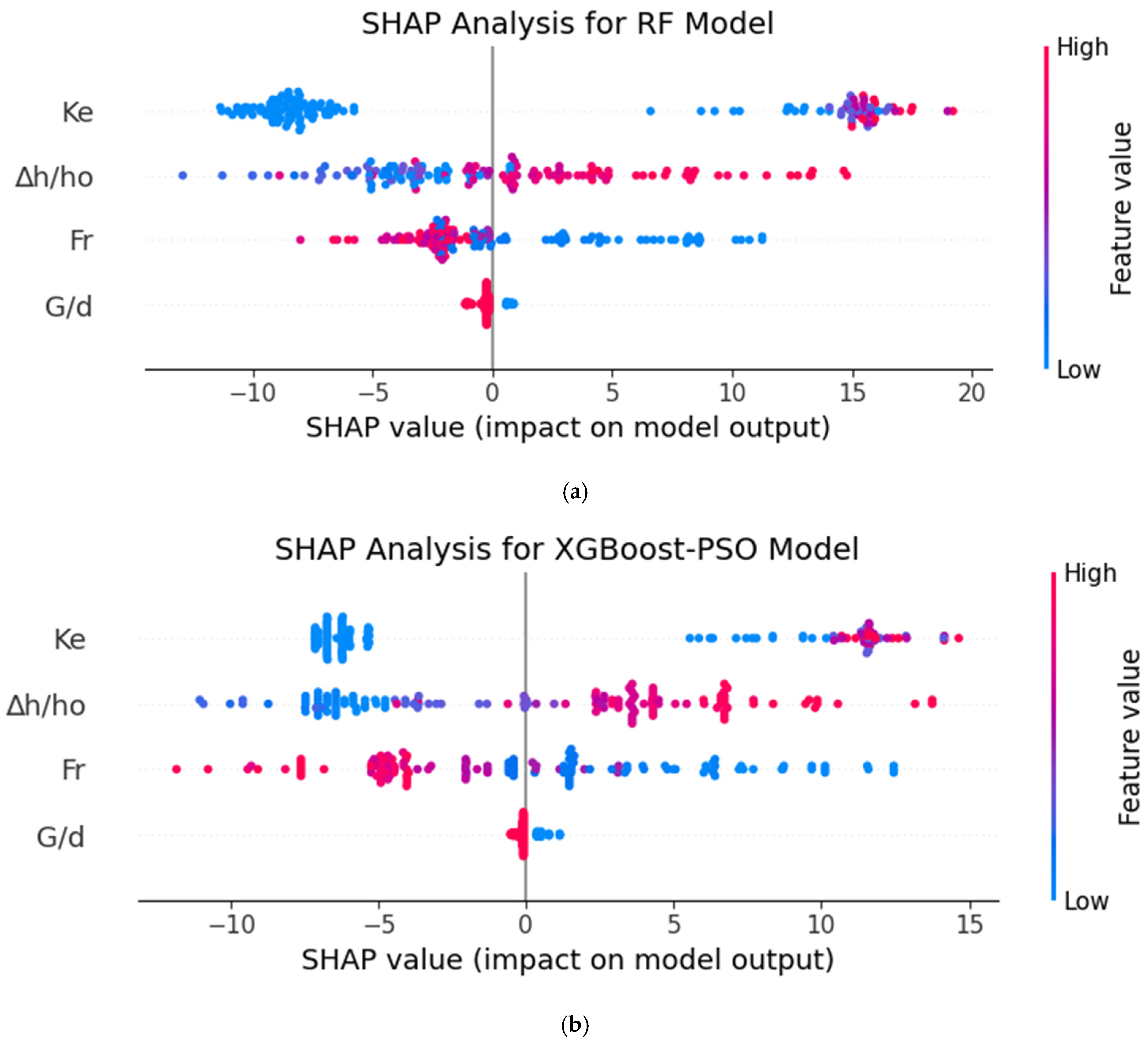 All the comparative analyses indicate that tree-based ensemble models (RF and XGBoost-PSO) are more suitable to predict energy dissipation of floodwater because of their flexibility to nonhomogeneous hydraulic conditions and their capability in predicting nonlinearities with multiple scales. The results have a great importance in hydraulic engineering, where the correct quantification of energy dissipation is vital in the design of flood control structures with resistance to erosion. Predictive models can enhance the assessment of hydrodynamic actions, minimize uncertainties during structure design, and improve the overall performance of flood-control infrastructure under multiple flow regimes. Moreover, the strong performance of RF suggests a practical and computationally efficient option for integrating machine learning into hydraulic design procedures, supporting more resilient and information-based decision-making in flood risk management.