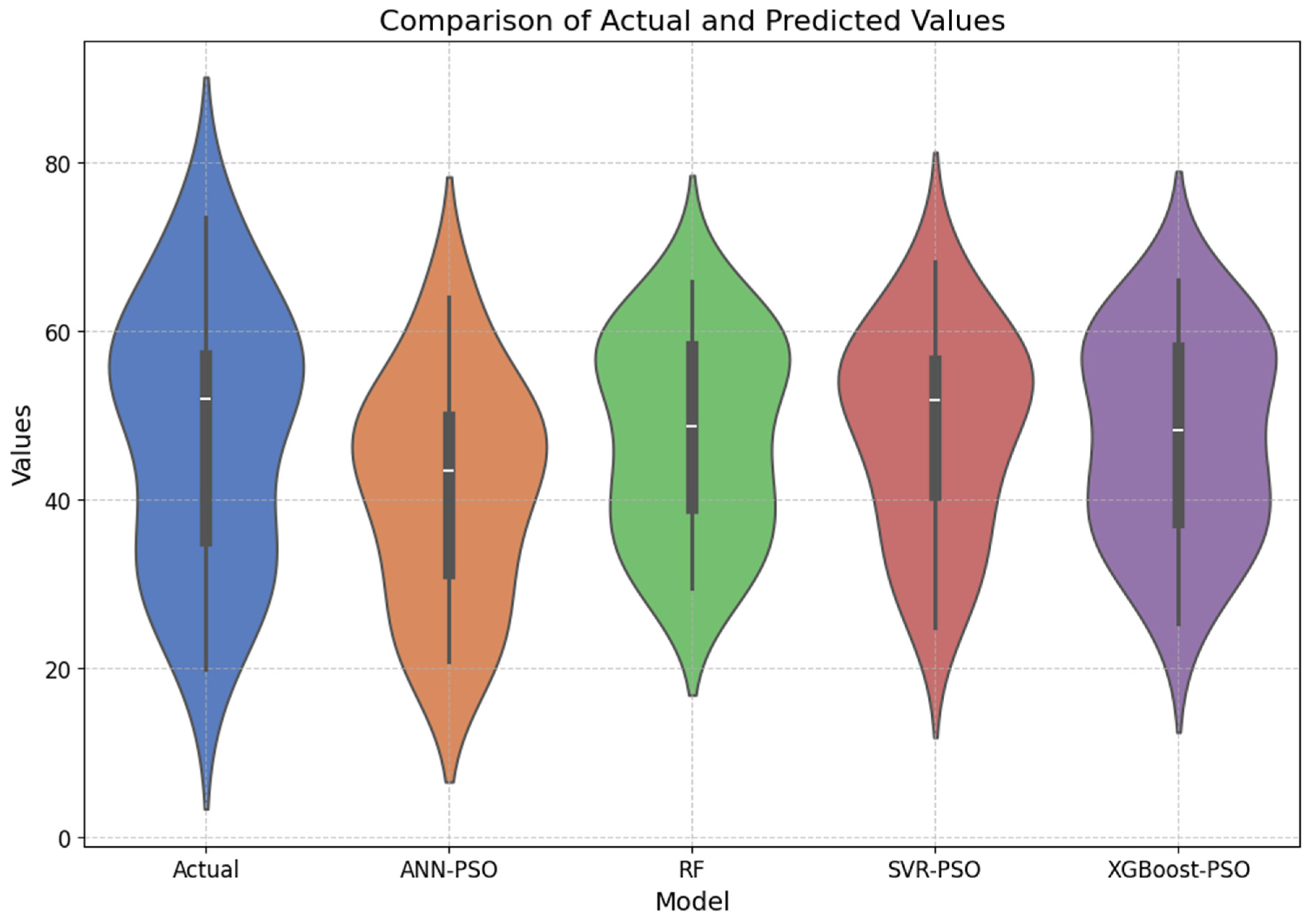 An ensemble-based model, Random Forest (RF), was used to display the model as a baseline to compare with the models optimized using the PSO algorithm. RF constructs numerous decision trees based on bootstrap samples of the training data and uses ensemble averaging to reduce overfitting and variance as compared with a single decision tree. In this research paper, RandomForestRegressor used 200 estimators (trees), and other parameters were set by default. The training was performed on 70 percent of the data, with 15 percent used to test the model and another 15 percent used to validate the model. The prediction results on every split of the whole dataset were compared, and the measures of the results were performance using R2 and mean squared error (MSE). RF produced consistent predictions because ensemble averaging overcame the impact of noise and data variability. RF has shown an adequate baseline performance with relatively low computational cost and quick training durations, although it was not tuned by applying the metaheuristic optimization tool, such as PSO-driven models. It had the primary drawback of low flexibility in terms of capturing highly complex nonlinearities as compared to SVR-PSO, ANN-PSO, and XGBoost-PSO. Nevertheless, RF has provided a competent benchmark model that is interpretable, efficient, and has predictive power compared to PSO-based optimization models.