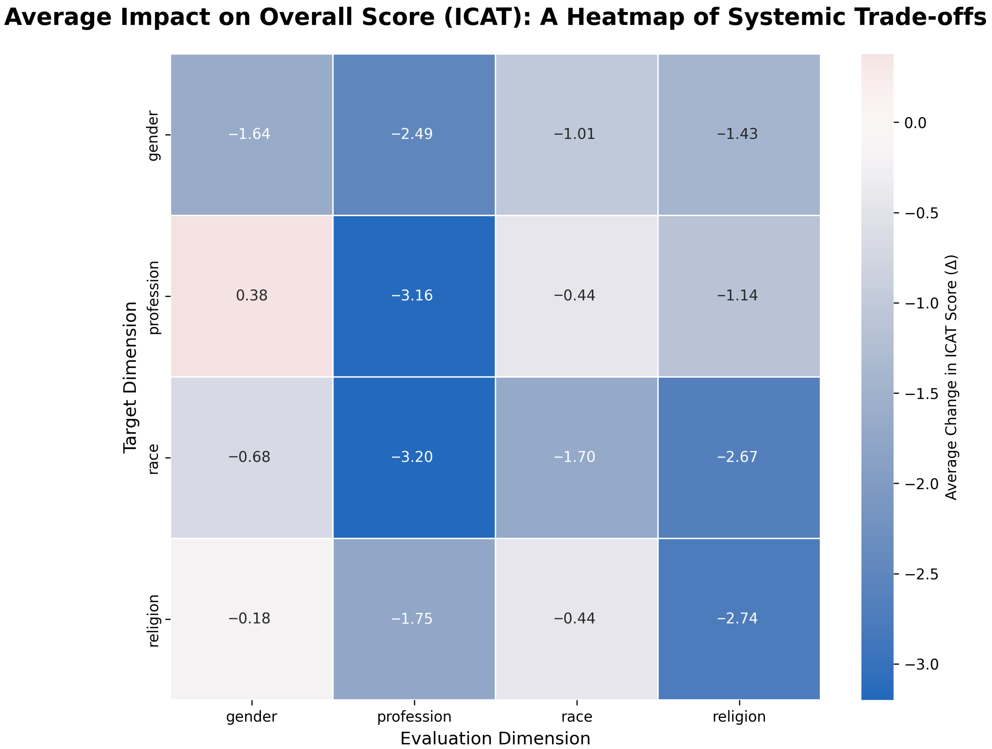 - Targeted interventions improved on-target ICAT scores in only 20.6% of cases, while causing statistically significant spillover harm in 31.5% of evaluations, representing a rate more than 1.5× higher than on-target success.