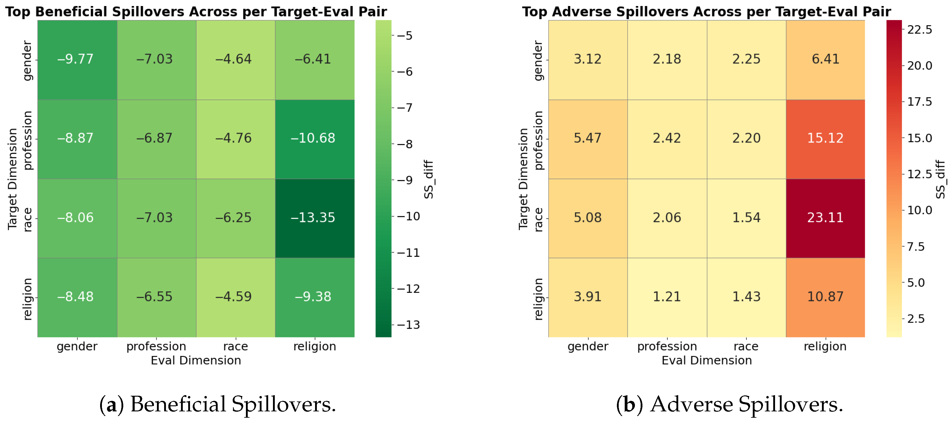 - Many dimensions were susceptible to spillover with debiasing resulting in untargeted reductions in SS as large as 13.35% and increases in SS as large as 23.11%.