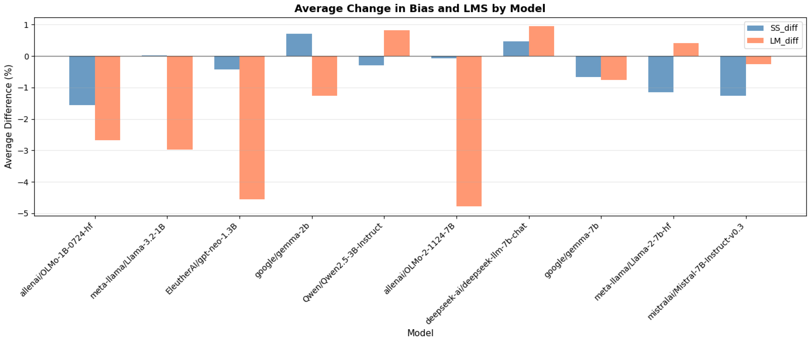 - Smaller models (≤2B parameters) experienced larger coherence losses (LMS drops) than larger models, highlighting how capacity constraints can exacerbate fairness–accuracy trade-offs.