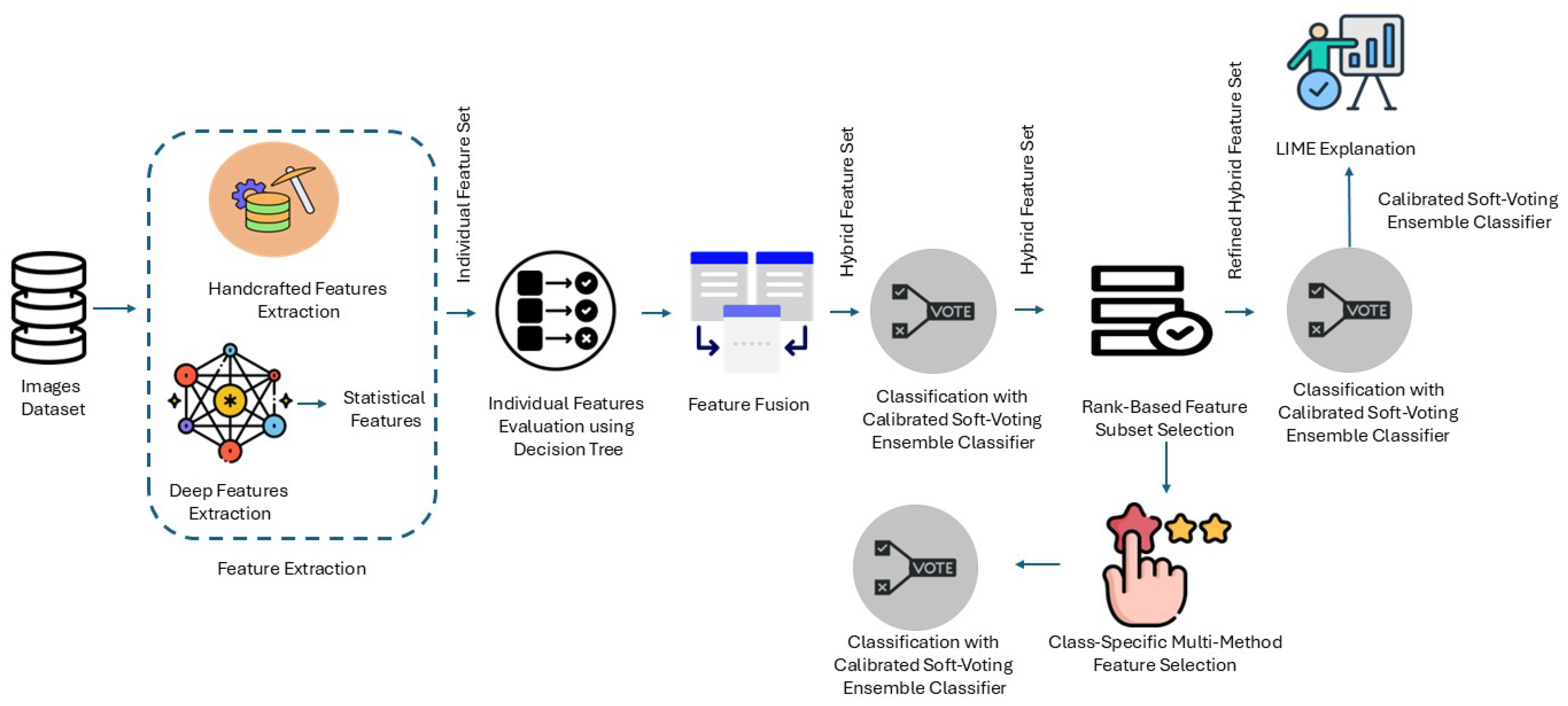 To overcome these limitations, the present work proposes a dual-stream explainable architecture that combines rich handcrafted features with statistically summarized deep features to find a balance between compactness, interpretability, and discriminability. In contrast to previous research, this work proposes a CSMMFS approach with rank-based pruning to eliminate redundancy and emphasize relevant features specific to every class. In addition, through the use of calibrated ensemble learning and LIME-based interpretability, the proposed framework not only achieves high classification performance over multi-modalities (MRI, ultrasound, retinal fundus) but also delivers clear and reliable insights for clinical decision-making.
