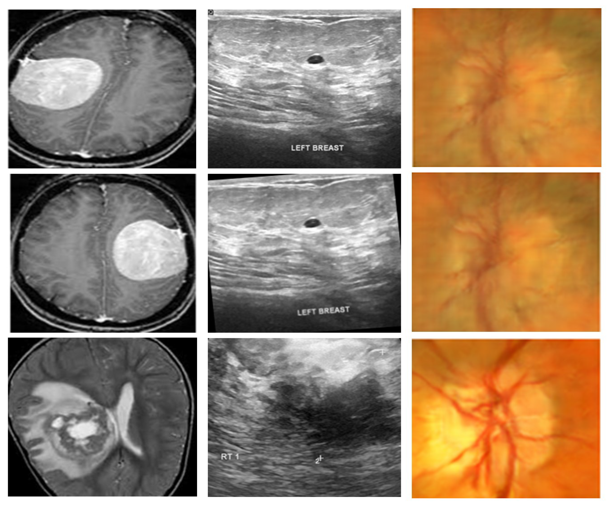 This cross-dataset assessment guarantees that the designed framework is tested on various imaging modalities (MRI, ultrasound, and retinal fundus) and disease categories (brain tumor, breast cancer, and glaucoma) to ensure robustness and flexibility.