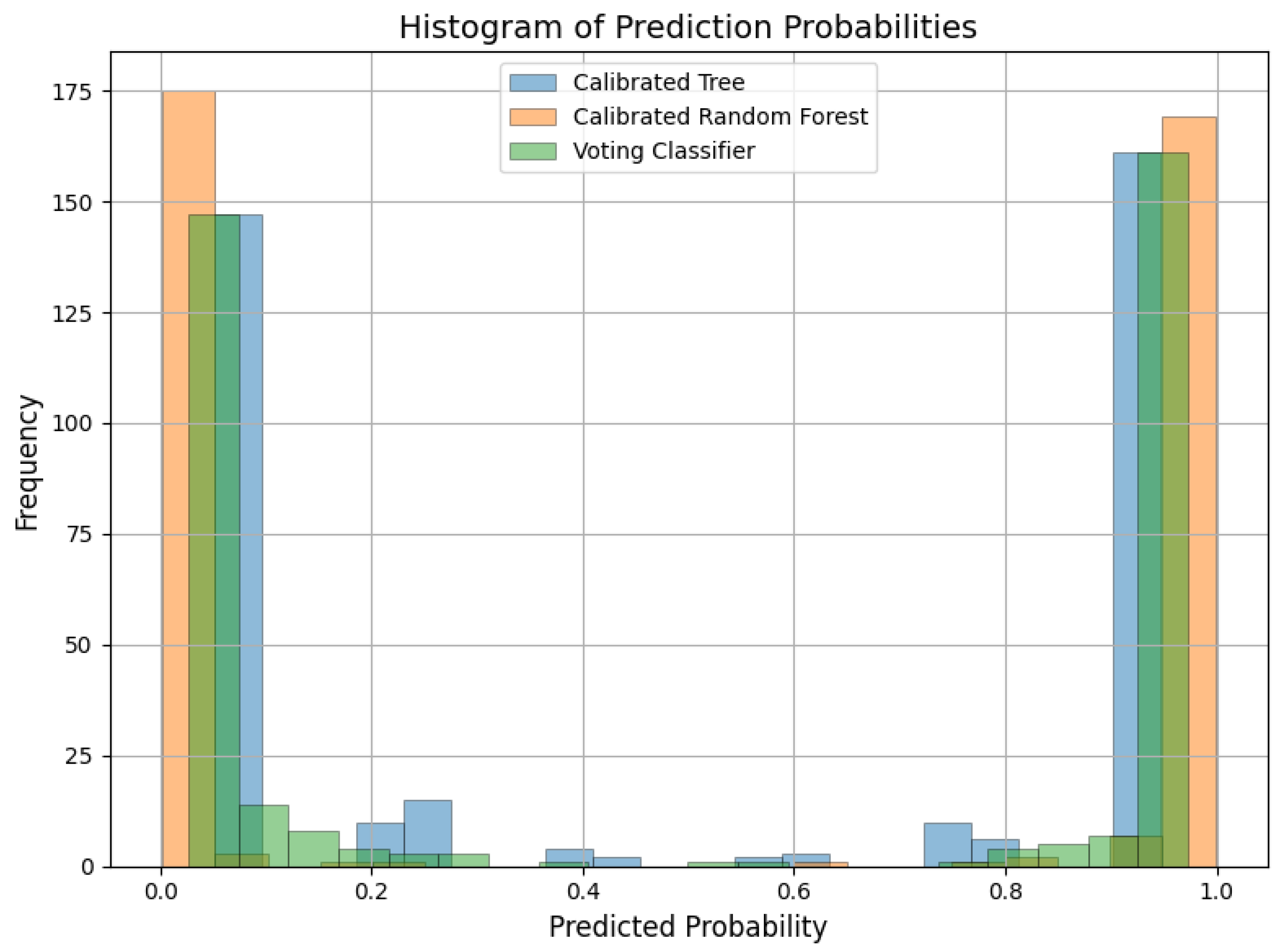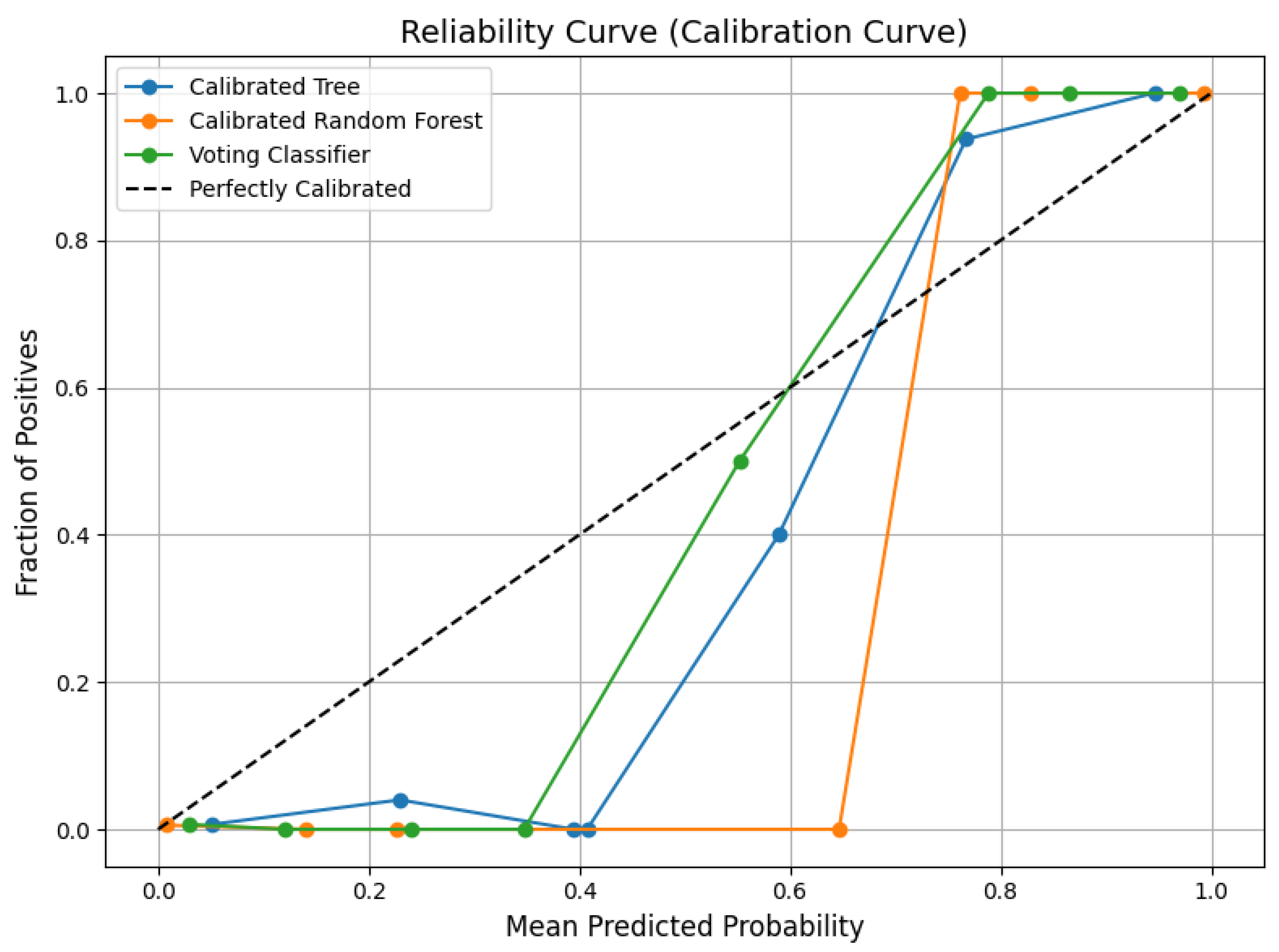Figure 3) shows predicted probability versus the actual outcome, where closeness to the diagonal represents good calibration. As demonstrated, the calibrated soft-voting classifier achieves probabilities that closely follow the ideal diagonal, reflecting well-calibrated estimates. Conversely, the calibrated DT and calibrated RF both have greater deviations, indicating less accurate probability estimates. Further insights are provided from the histograms of probabilities (