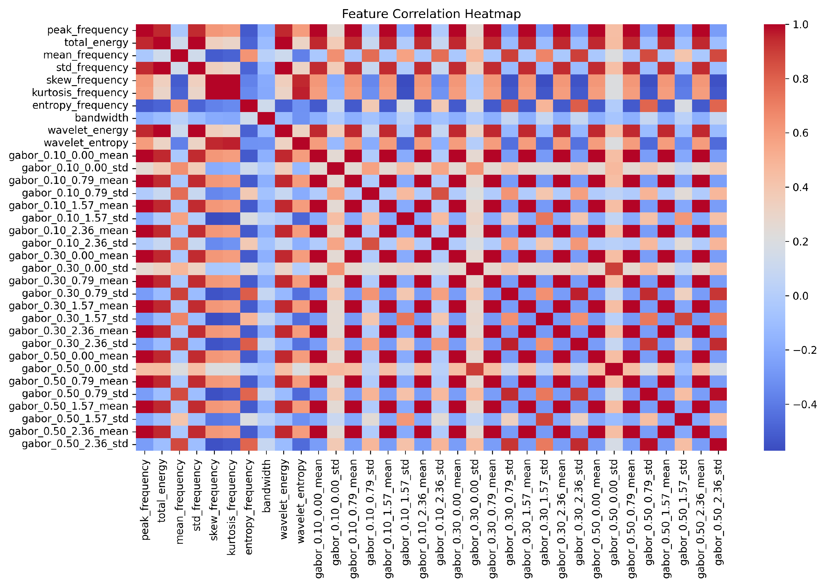 Figure 5). This heatmap provides a visual representation of the Pearson correlation coefficients between the final refined hybrid feature set, i.e., Gabor and FDF, offering insights into the diversity and complementarity of the selected features. Minimal high correlations are observed, indicating that the fused features contribute independently to the classification task. The results highlight that settling on a small yet meaningful feature set, aided by the rank-based subset selection, not only improves computational efficiency but also enhances classification performance.