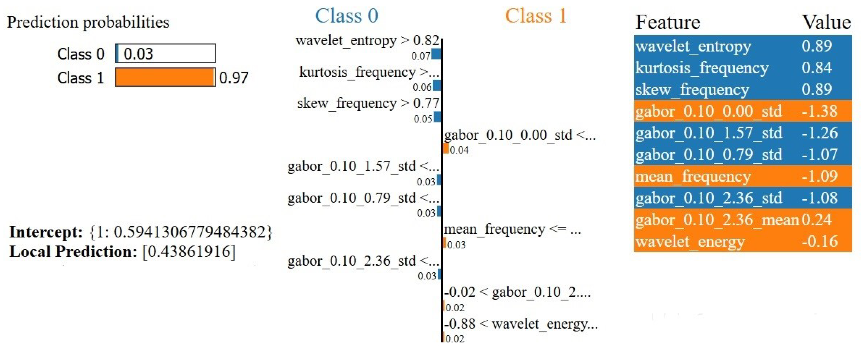 Figure 6. The classifier gave a probability of 0.97 to Class 1 (malignant), with 0.03 for Class 0 (benign). The LIME explanation presents the interpretation of specific features that contribute to the prediction made. For instance, wavelet_entropy, kurtosis_frequency, and skew_frequency contributed towards Class 0 (benign), while features like gabor_0.10_0.00_std, mean_frequency, and wavelet_energy contributed heavily in the positive direction for Class 1 (malignant). The value of the intercept, 0.5941, gives a prior probability for Class 1 (malignant) before considering individual feature contributions. The local prediction of the instance, computed to be 0.4386, is the probability for Class 1 based on only those features present in the LIME explanation. While the local prediction does not exactly match the overall prediction of 0.97, this indicates how those key features are influencing the model’s decision. This difference suggests that further features beyond those present in this LIME explanation also weigh heavily on making the final prediction probability.