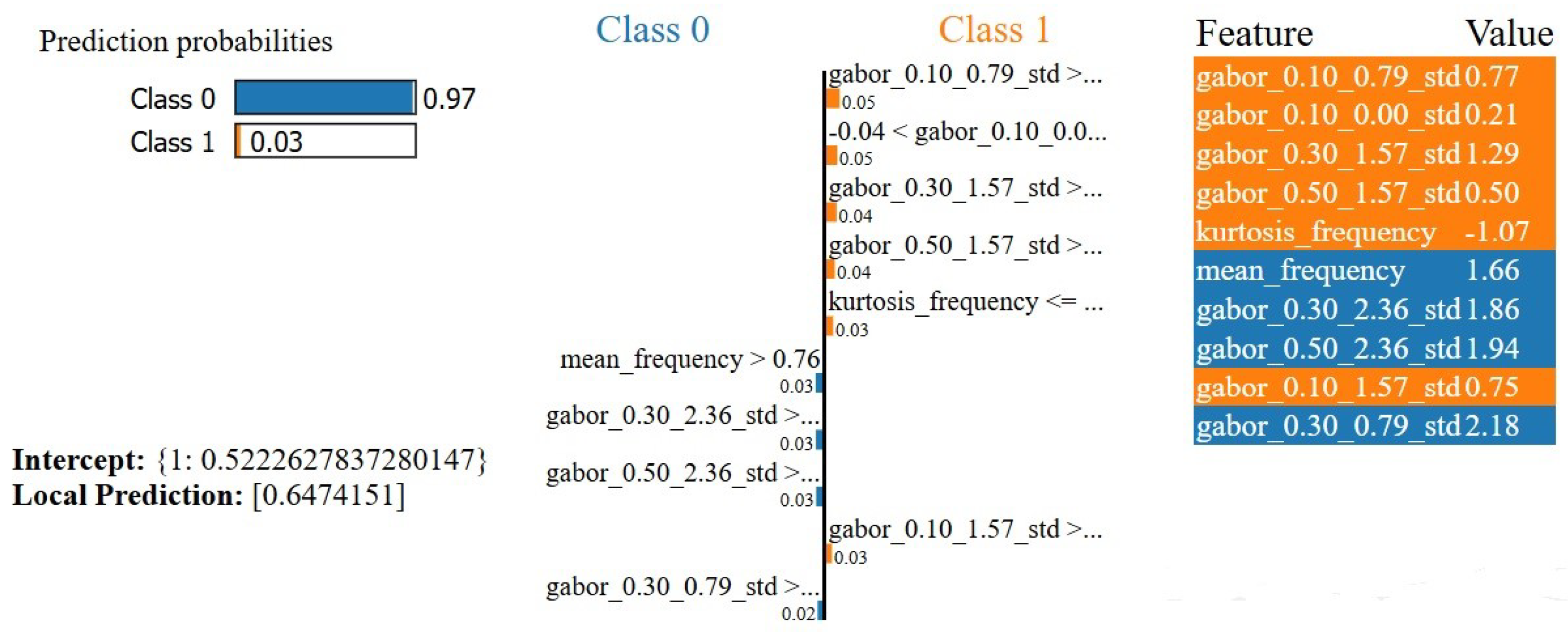 Figure 7. Class 0 (Benign) is predicted by the classifier with a high probability of 0.97, whereas Class 1 (Malignant) is expected with a probability of 0.03. Bars of feature contributions depict several features that came into play in making the prediction. The most influential attributes toward Class 0 (benign) are mean_frequency, gabor_0.30_2.36_std, and gabor_0.50_2.36_std, for which the probability of prediction was shifted. In contrast, attributes that supported Class 0 had a much stronger general influence than those that supported Class 1, malignant, such as gabor_0.10_0.79_std, gabor_0.10_0.00_std, and gabor_0.10_1.57_std. By far, the feature that best supported Class 0 was the mean_frequency, contributing positively with a high value of 1.66. The intercept value of 0.5223 represents the base probability of Class 0 (benign) before the contributions of the individual variables. It means predicting the model for those cases without feature-specific effects. In this case, considering only the described attributes, the local prediction is estimated to be 0.6474, and the predicted class is Class 0 (benign). This number shows that the selected features in the LIME explanation account for most of the model’s conclusion since it is very close to the overall prediction probability of 0.97 for Class 0.