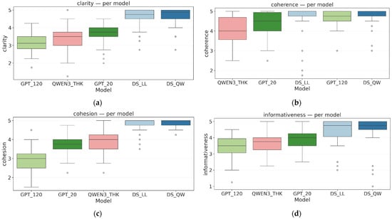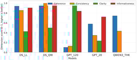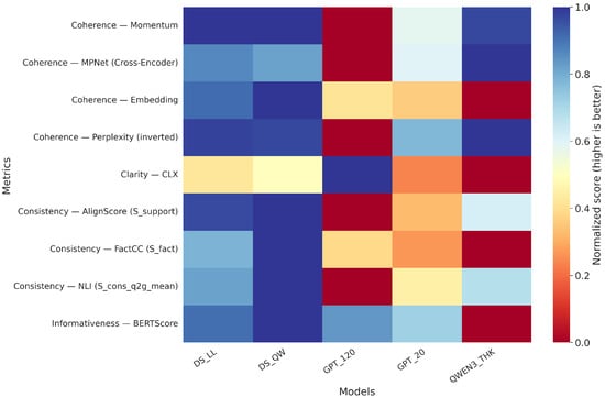 We apply a quantitative, multidimensional text-evaluation framework (Figure 1). The framework spans four core axes that are standard in text quality assessment: (A) coherence and fluency, (B) logical–factual consistency, (C) clarity and readability, and (D) coverage and informativeness. These axes are instantiated through a combination of automatic text-based metrics, logic-based scores (ACS, FAS0, JSS, RCR), and an aligned human evaluation protocol described in the following subsections. Where applicable, scores are normalized to [0, 1] to facilitate cross-metric comparisons, and hyperparameters are fixed across models to promote reproducibility. We deliberately avoid external grammar-correction tools (e.g., LanguageTool) to keep the framework lightweight and easy to integrate.
