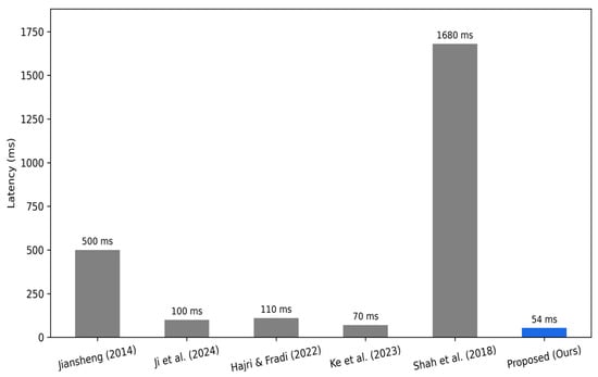 Latency comparison between the proposed system and existing methods [4,7,8,19,26]. Because only a subset of prior works report latency or time-to-alert (TTA), the figure shows results only for studies providing these values.